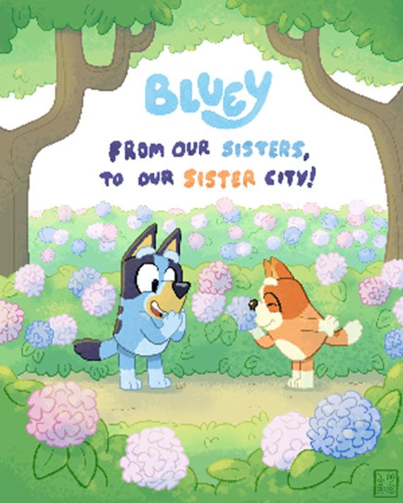 「From our sisters,To our sister city!」(ブルーイ・ビンゴ姉妹より、姉妹都市神戸へ)