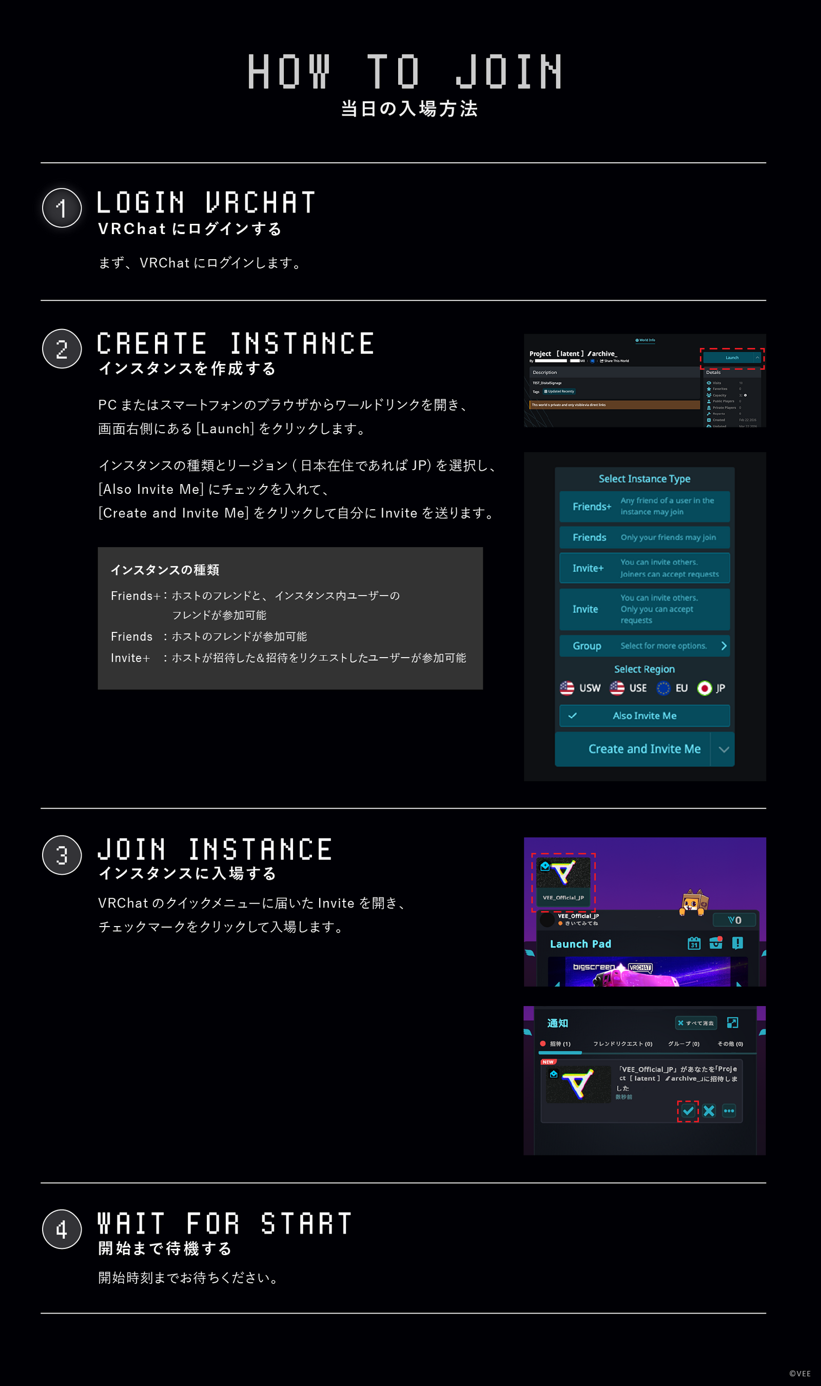 ・Friends+:ホストのフレンドと、招待されたインスタンス内ユーザーのフレンドが参加可能