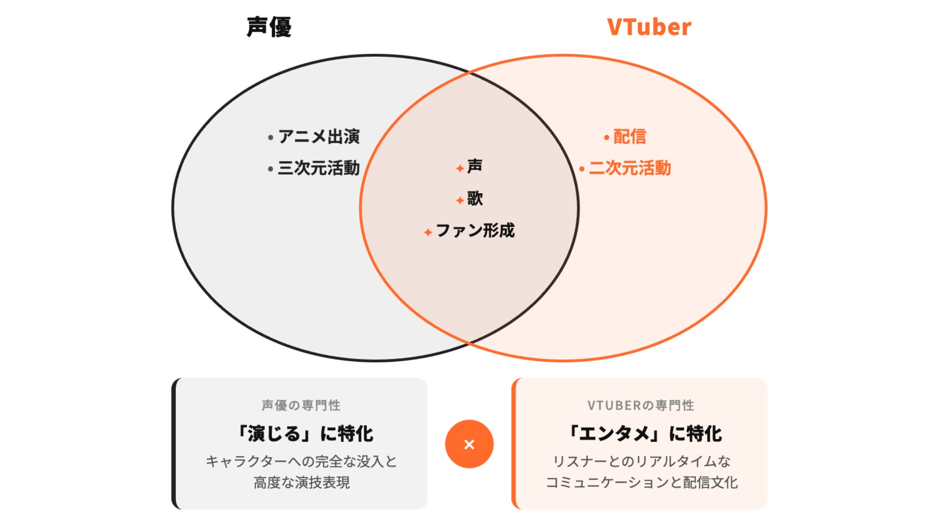 一方でVTuberやライブ配信は、キャラクター性・継続的な演技・リスナーとのコミュニケーションといった要素を持ち、声優スキルとの親和性が高い領域です。