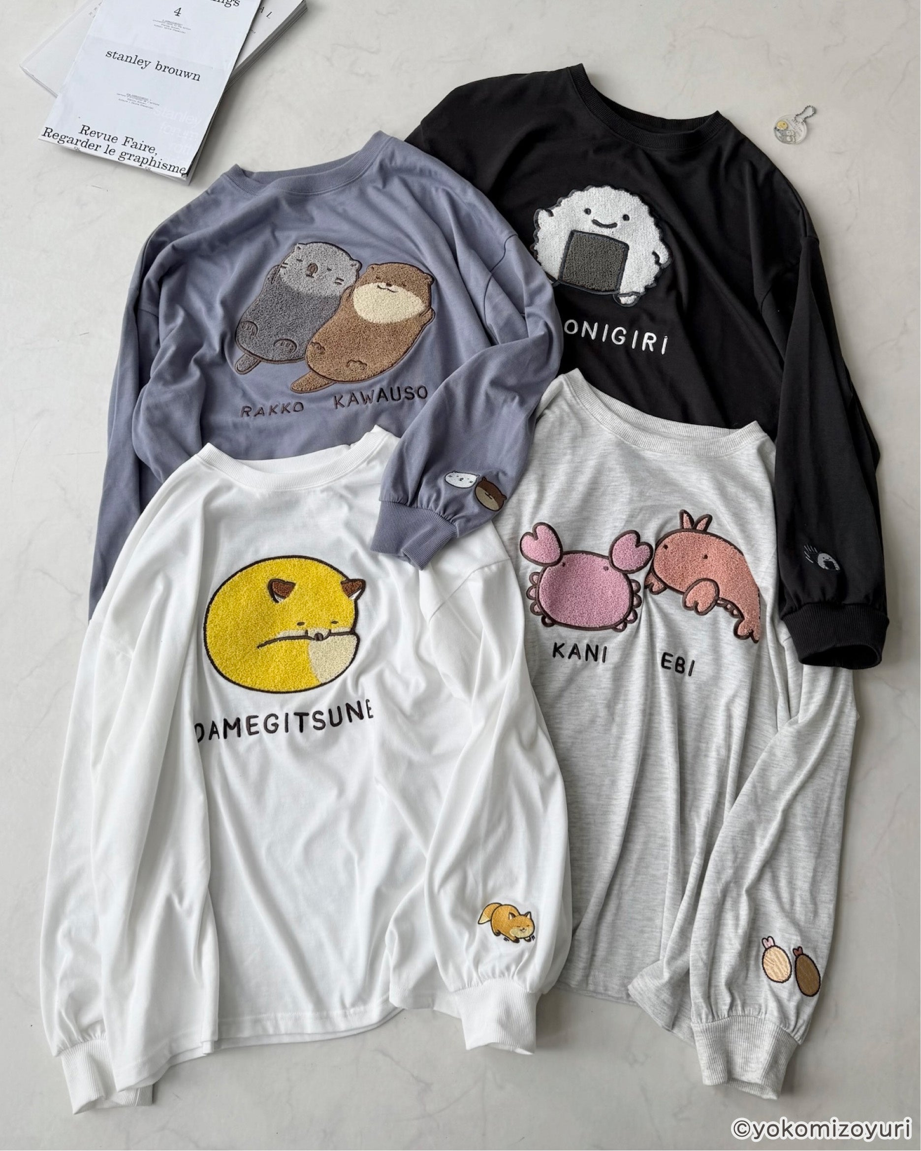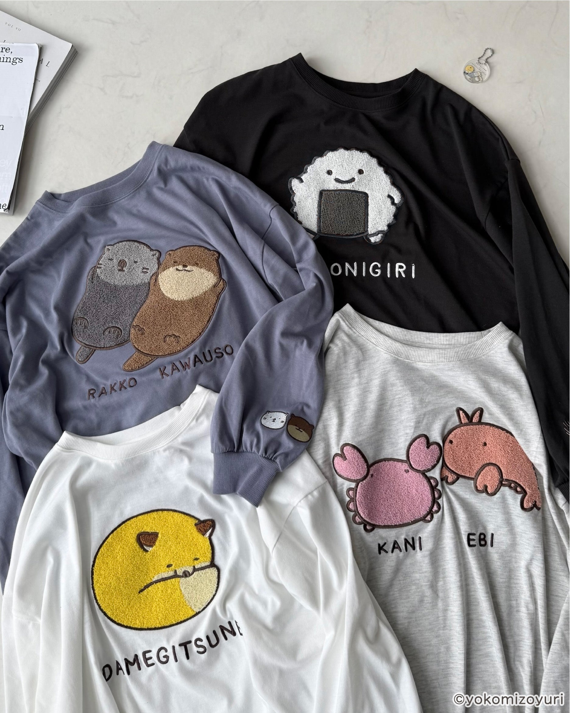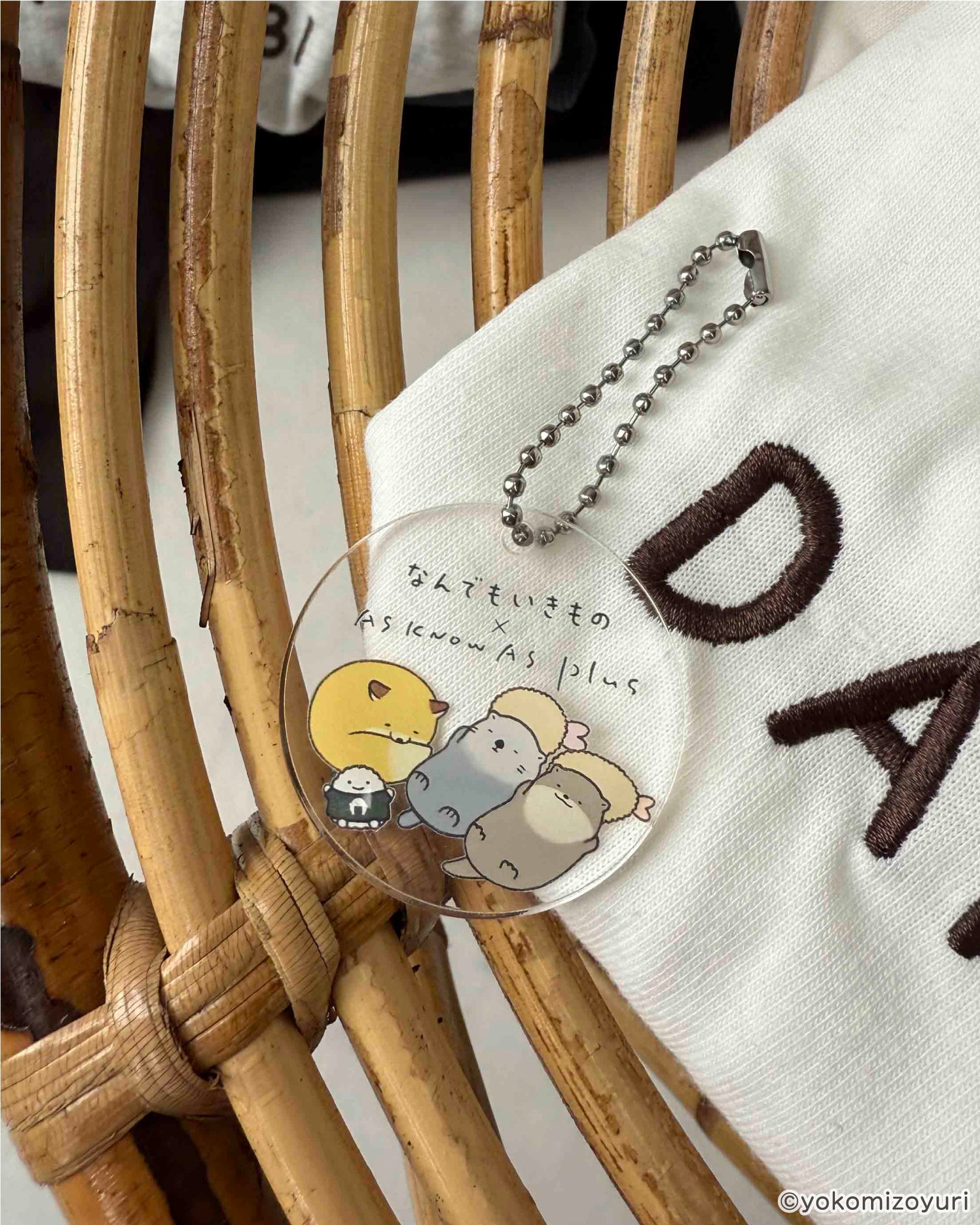 よこみぞゆりさんの描く 『 なんでもいきもの 』のキャラクターたちがふわふわとデザインされたロンTがAS KNOW AS plusから登場♪アクリルキーホルダーもセット。