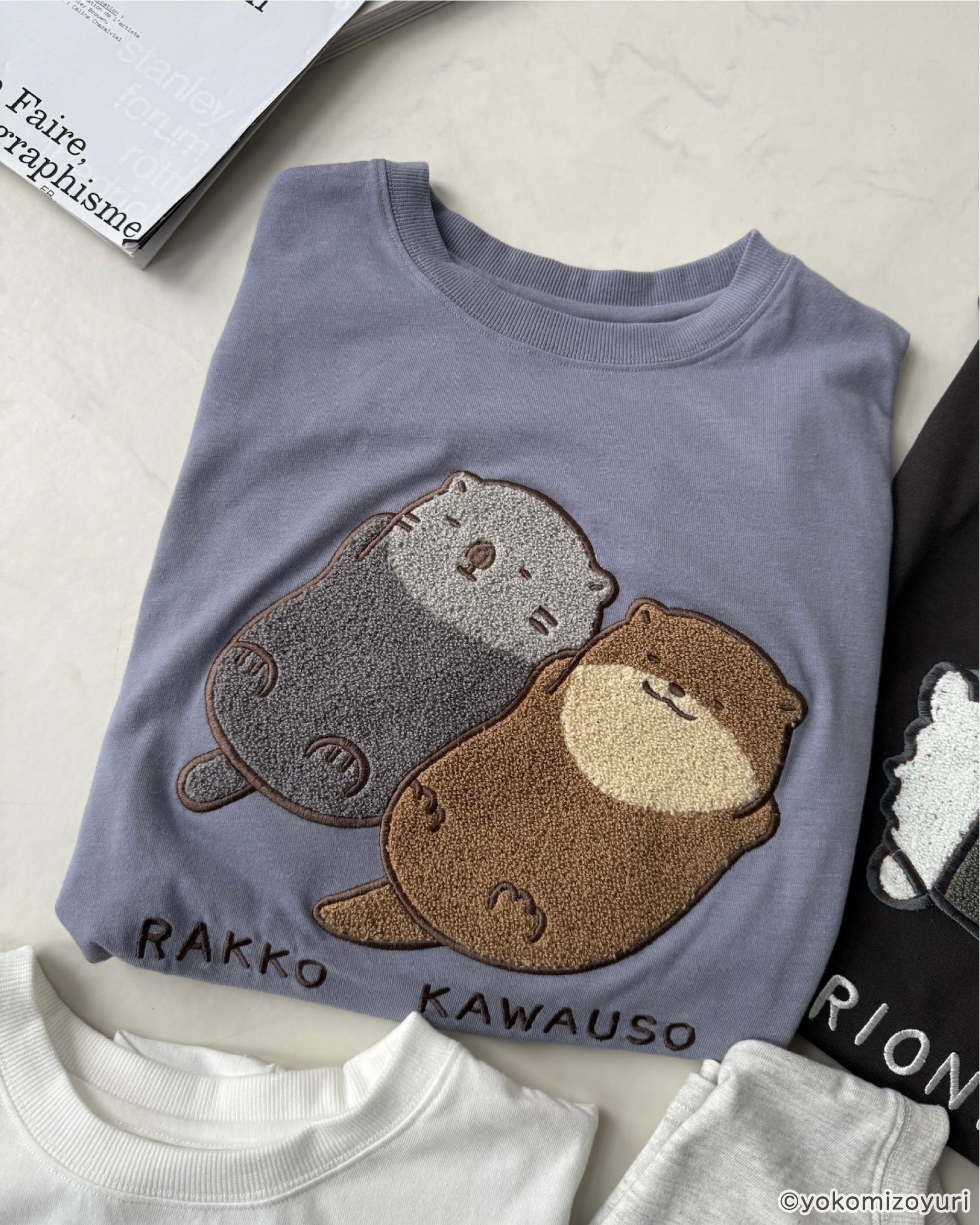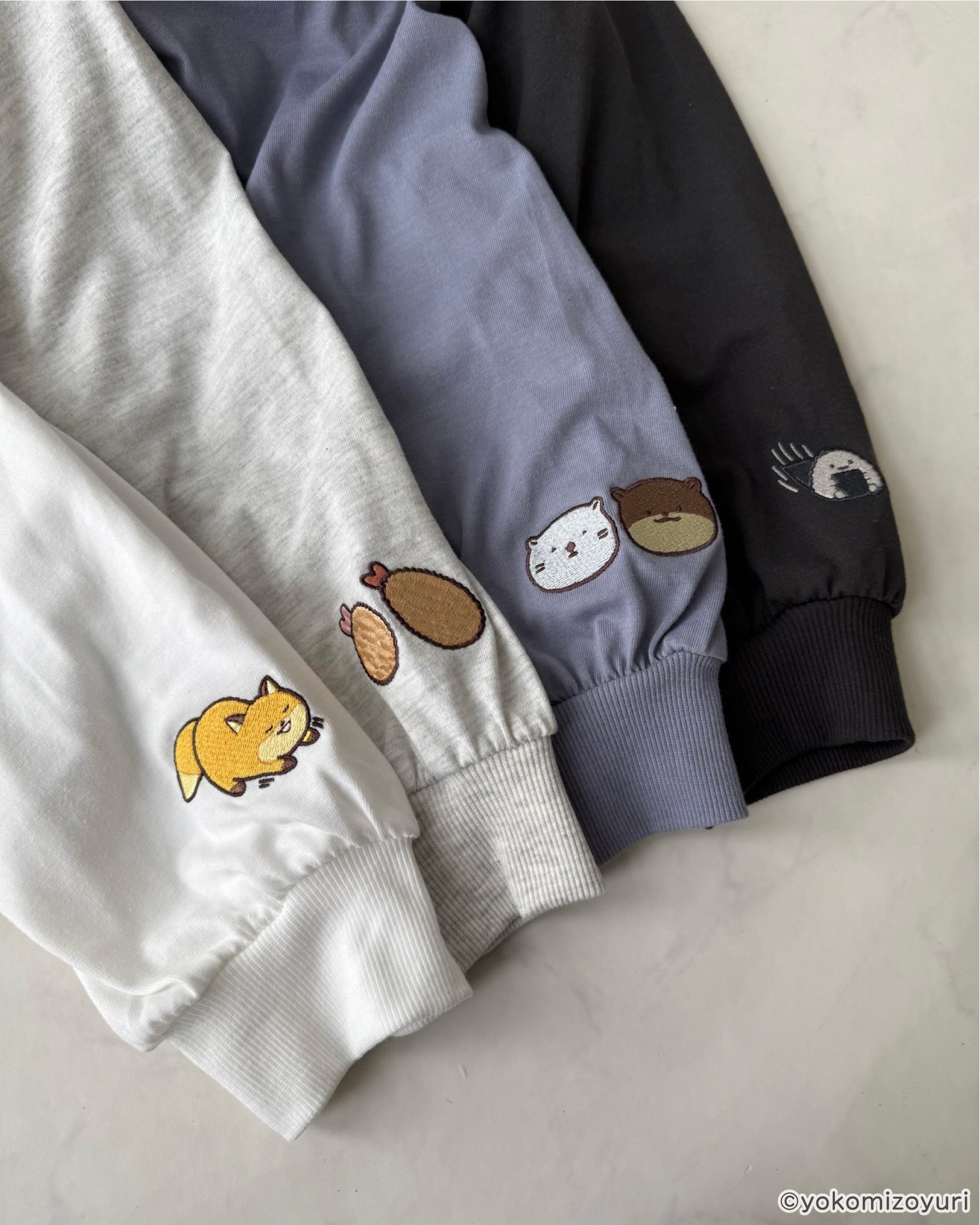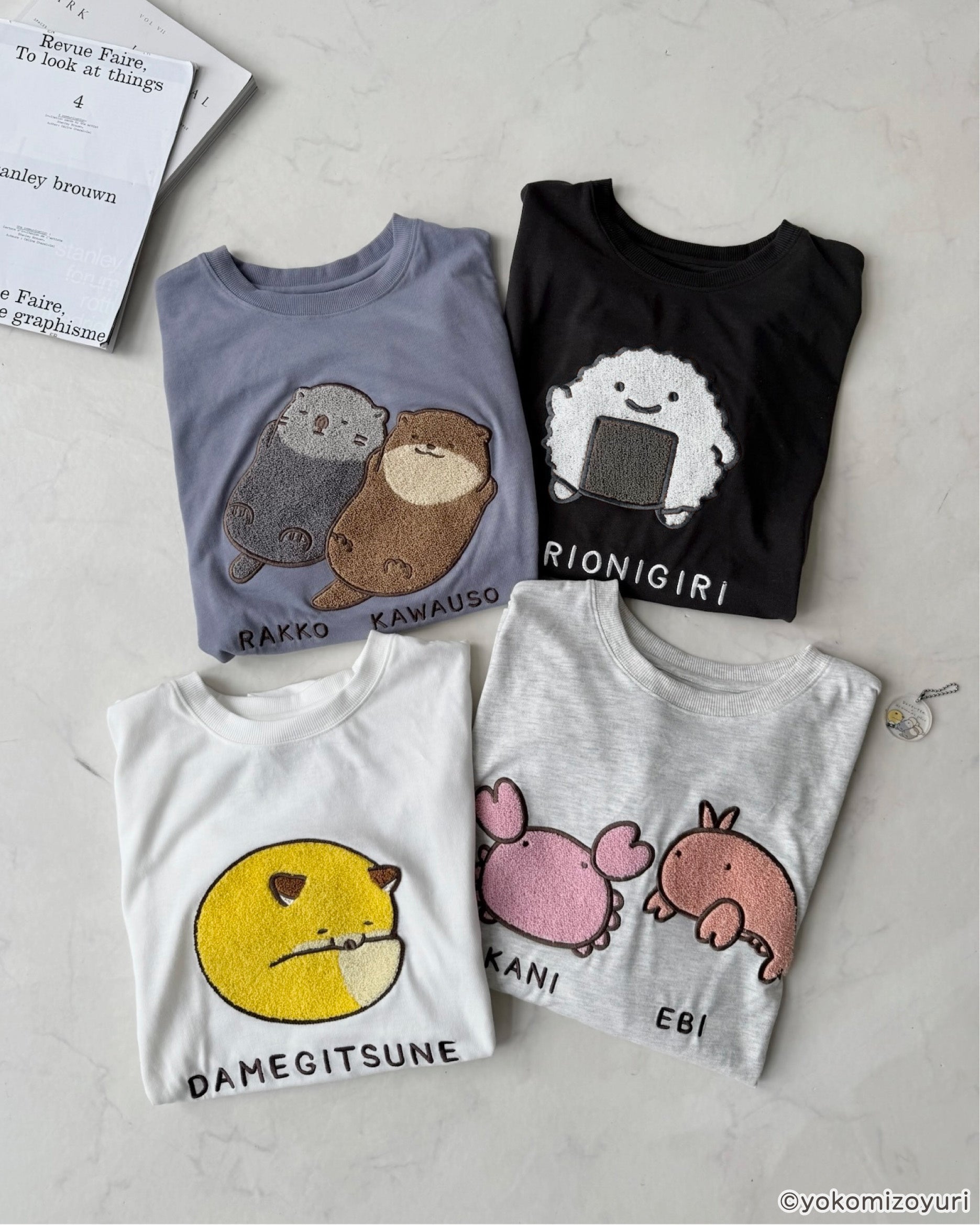 よこみぞゆりさんの描く 『 なんでもいきもの 』のキャラクターたちがふわふわとデザインされたロンTがAS KNOW AS plusから登場♪アクリルキーホルダーもセット。