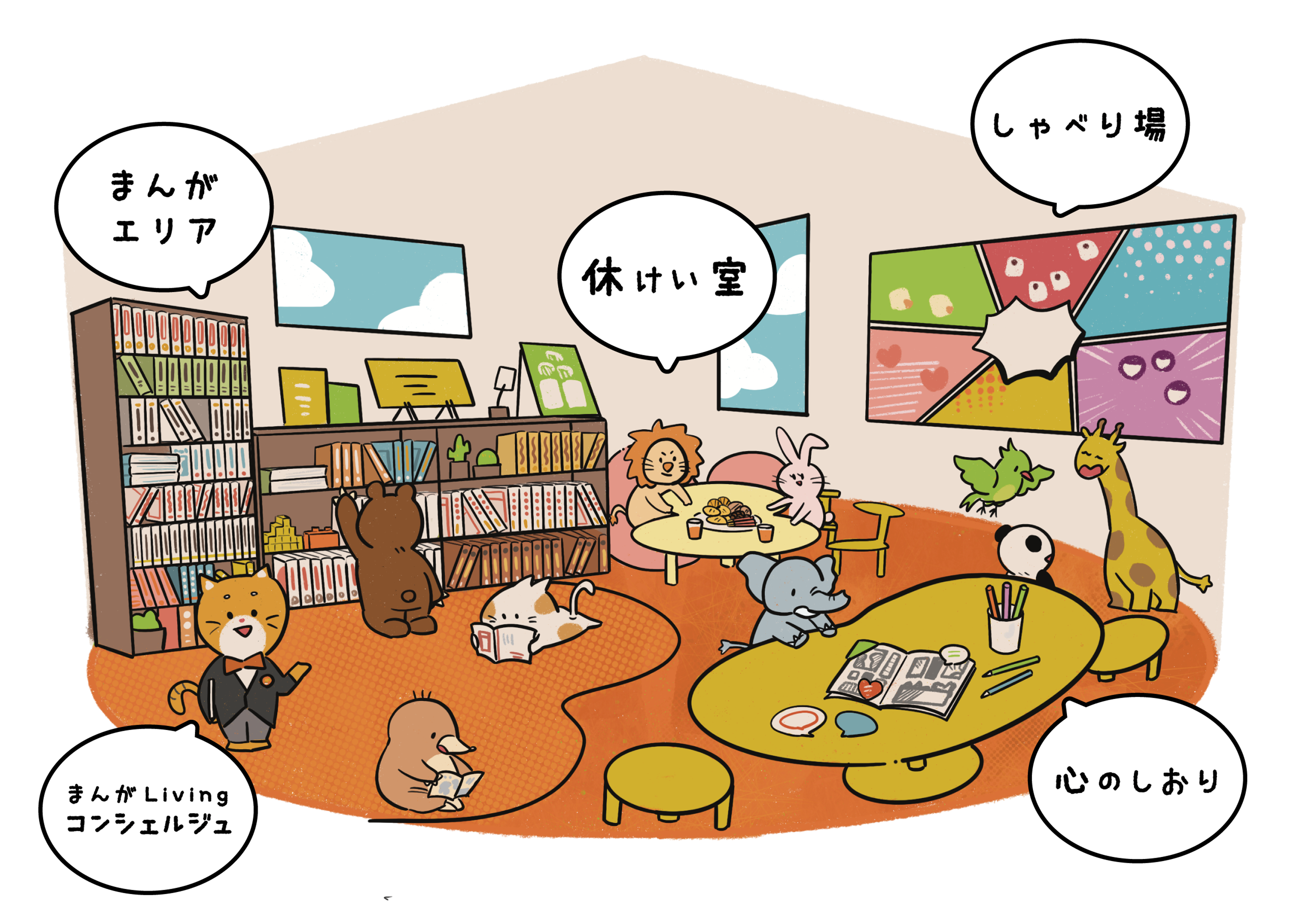 「まんがLiving」を訪れた子どもたちとコミュニケーションをとれるよう「まんがLivingコンシェルジュ」を定期的に配置することで、人との共感体験を積み重ねます。