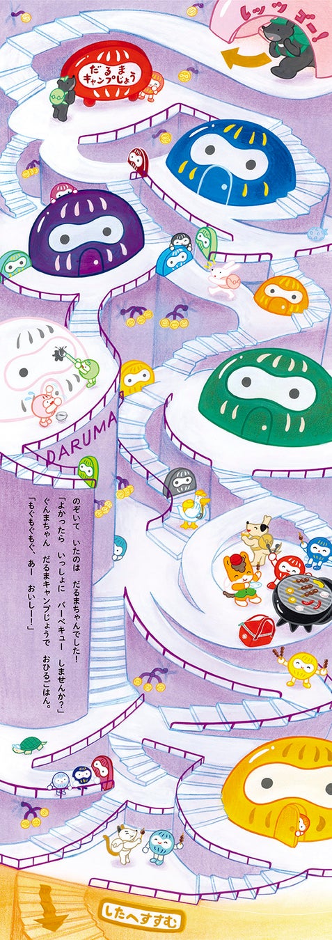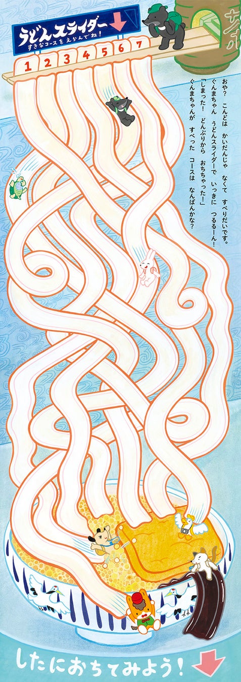 地下へ地下へ降りてゆくと、そこで待っていたのは……!? 不思議がいっぱいのトンネルへ。大冒険に出発だ! だるま、こんにゃく、うどん……群馬県の名物を学びながら、楽しく迷路遊びもできちゃう! 仕掛けページは超ビッグサイズの迷路! 大人も子供も、何度も何度も楽しめます! ぜひご一読ください。