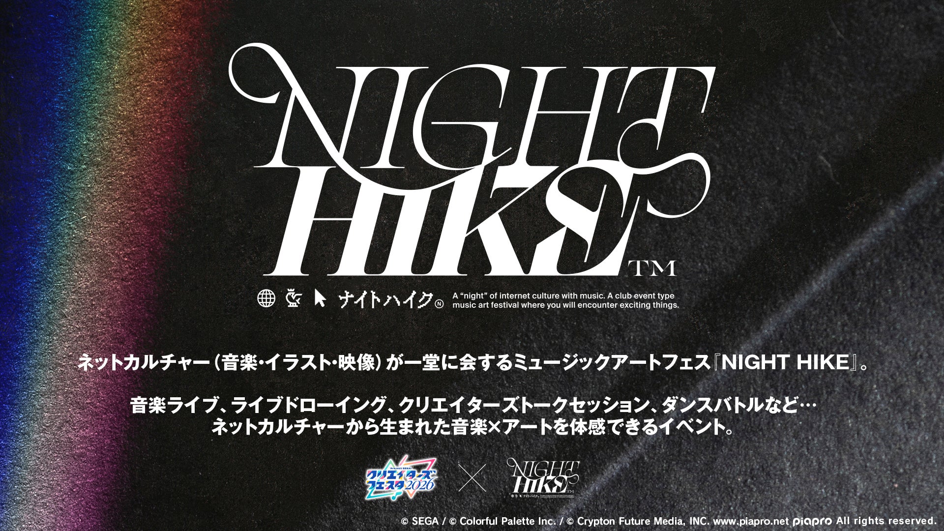 本イベントでは、イラストレーター・ボカロPら総勢129名による即売会に加え、音楽・イラスト・映像などのネットカルチャーをライブやDJを通じて体感できるミュージックアートフェス「NIGHT HIKE」とコラボレーションしたDJライブステージ「CREATORS PLAYGROUND supported by NIGHT HIKE」を実施します。あわせて、人気声優とボカロPによる対談「ボカロミュージックのセカイ 出張版」を開催します。チケットのオフィシャル先行抽選はローソンチケットにて受付を開始しています。