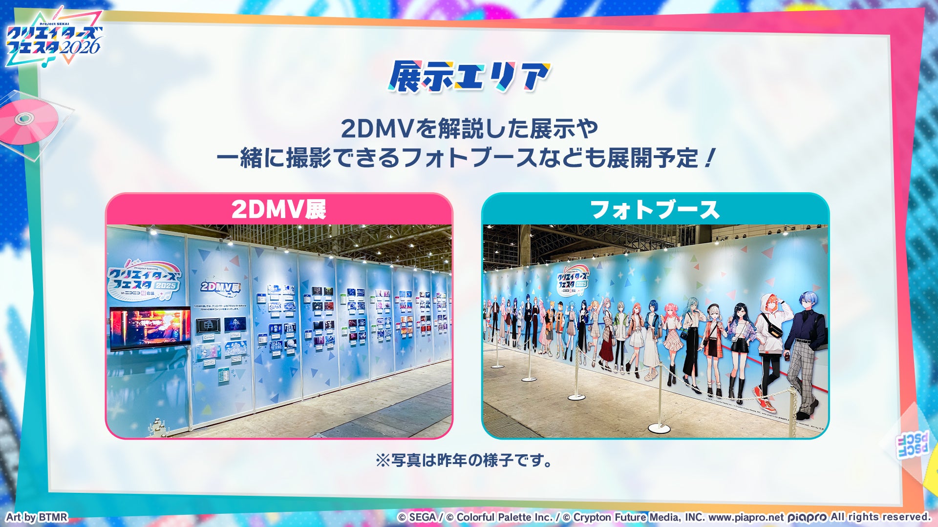 毎年恒例の「2DMV展」に加え、本イベントのオリジナル衣装を着用したキャラクターパネルなど本イベント独自のコンテンツを展示いたします。