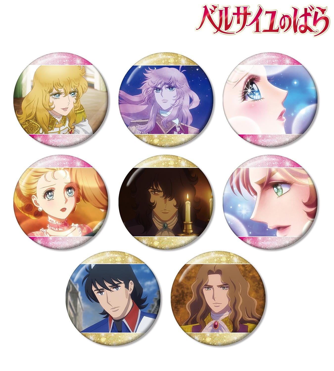 オスカル、マリー・アントワネット、アンドレ、フェルゼン、アラン、ジェローデルの印象的なシーンを缶バッジに仕上げました。