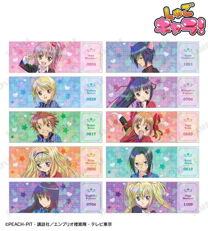 日奈森 あむ、月詠 イクト、辺里 唯世、藤咲 なでしこ、相馬 空海、結木 やや、真城 りま、三条 海里、藤咲 なぎひこ、ほしな 歌唄のイラストをホログラムチケット風カードのイラストカードに仕上げました。
