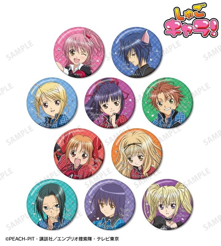 日奈森 あむ、月詠 イクト、辺里 唯世、藤咲 なでしこ、相馬 空海、結木 やや、真城 りま、三条 海里、藤咲 なぎひこ、ほしな 歌唄のイラストをジュエリー加工の缶バッジに仕上げました。