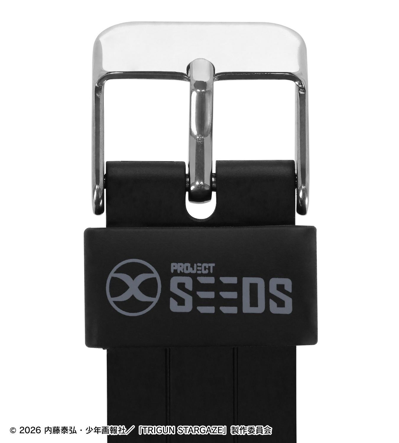 ブラックを基調としたボディに、ストラップと文字盤の「プロジェクトSEEDS」ロゴが映えるデザインで、ユニセックスかつカジュアルに使いこなせるコンセプトに仕上げました。