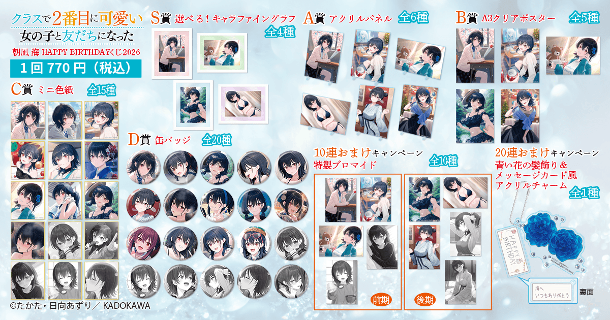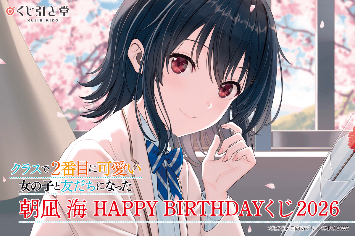 株式会社KADOKAWA(本社:東京都千代田区、取締役 代表執行役社長 CEO:夏野 剛、以下 KADOKAWA)は、運営するオンラインくじサービス「くじ引き堂」において、『クラスで2番目に可愛い女の子と友だちになった』の豪華賞品が手に入る<『クラスで2番目に可愛い女の子と友だちになった』朝凪 海 HAPPY BIRTHDAYくじ2026>を、2026年4月3日(金)12時より販売します。