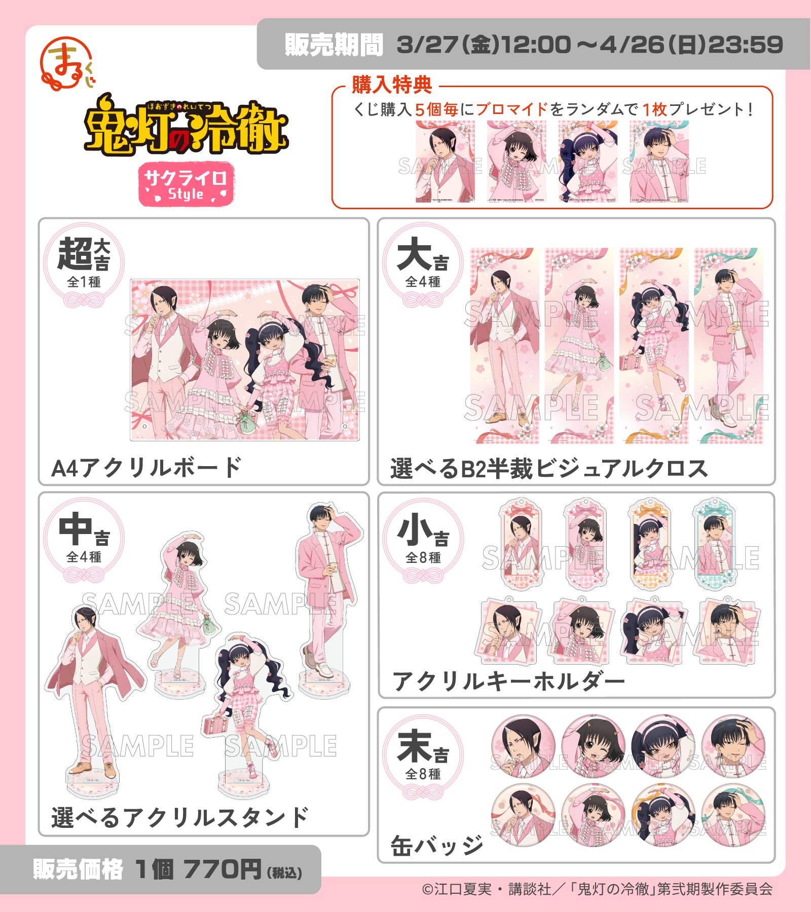 今回のまるくじ TVアニメ『鬼灯の冷徹』サクライロStyleでは、春にぴったりのサクライロ衣装に身を包んだ鬼灯、ピーチ・マキ、ミキ、白澤の4人の、新規描き下ろしイラストを使用したオリジナルグッズをご用意しました!