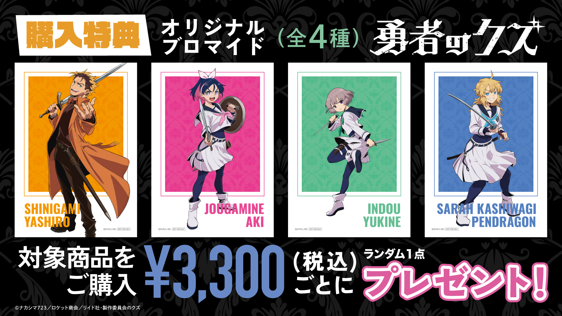 販売期間中、対象商品を3,300円(税込)お買い上げごとに【購入特典ブロマイド(全4種)】をランダムで1点プレゼントいたします。