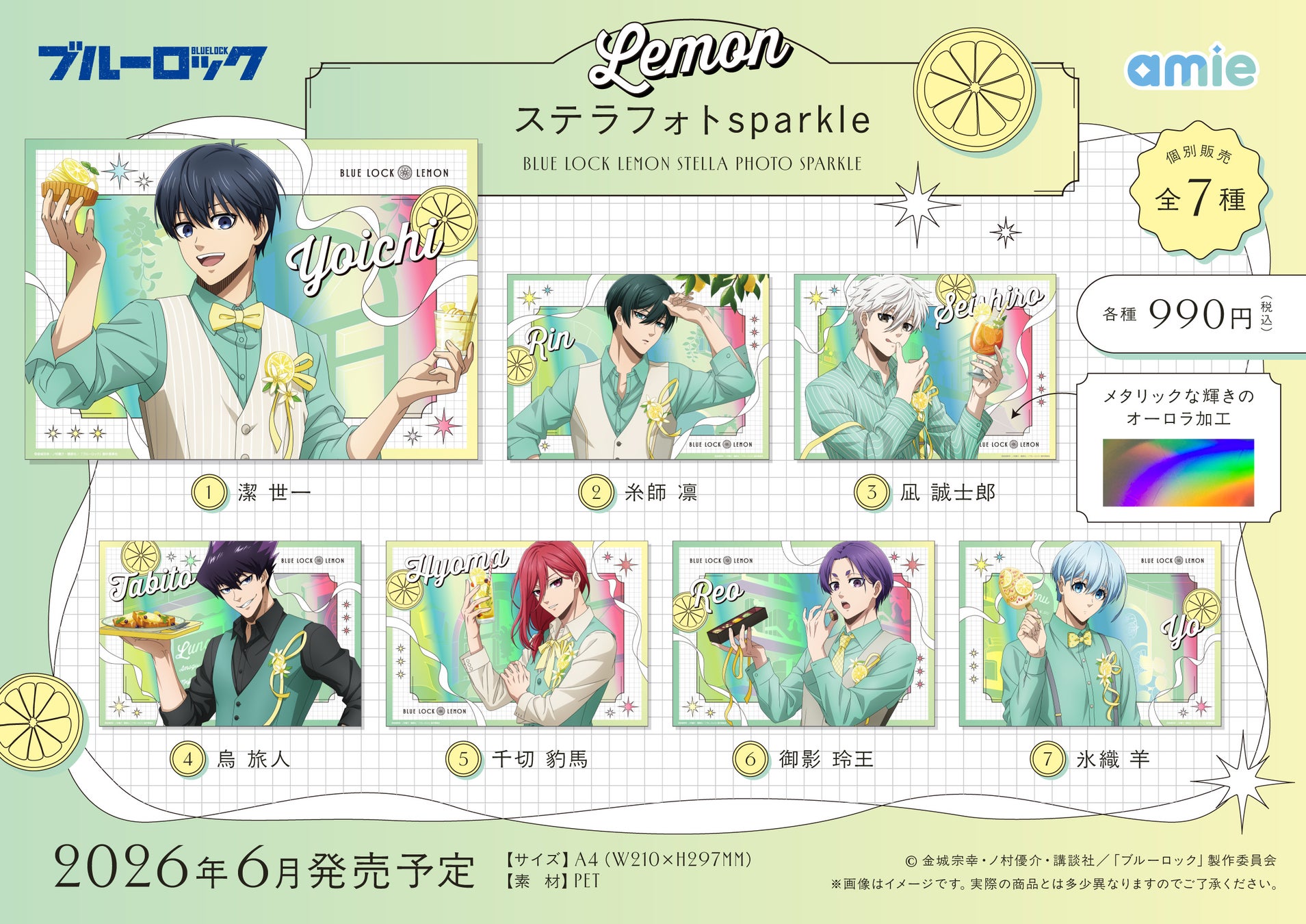 フィギュア&ホビー通販大手の「あみあみ」を運営する大網株式会社(本社・東京都文京区)は、自社が展開するグッズブランド「amie(アミィ)」から、TVアニメ『ブルーロック』の「レモン」がテーマの描きおろし商品として、「トレーディング箔押し缶バッジ」「シャイニーカードコレクション premium」「ぴくりあプレート hologram」「ステラフォトsparkle」「Sparkle*チェーンアクリル」「アクリルスタンド」を発売いたします。