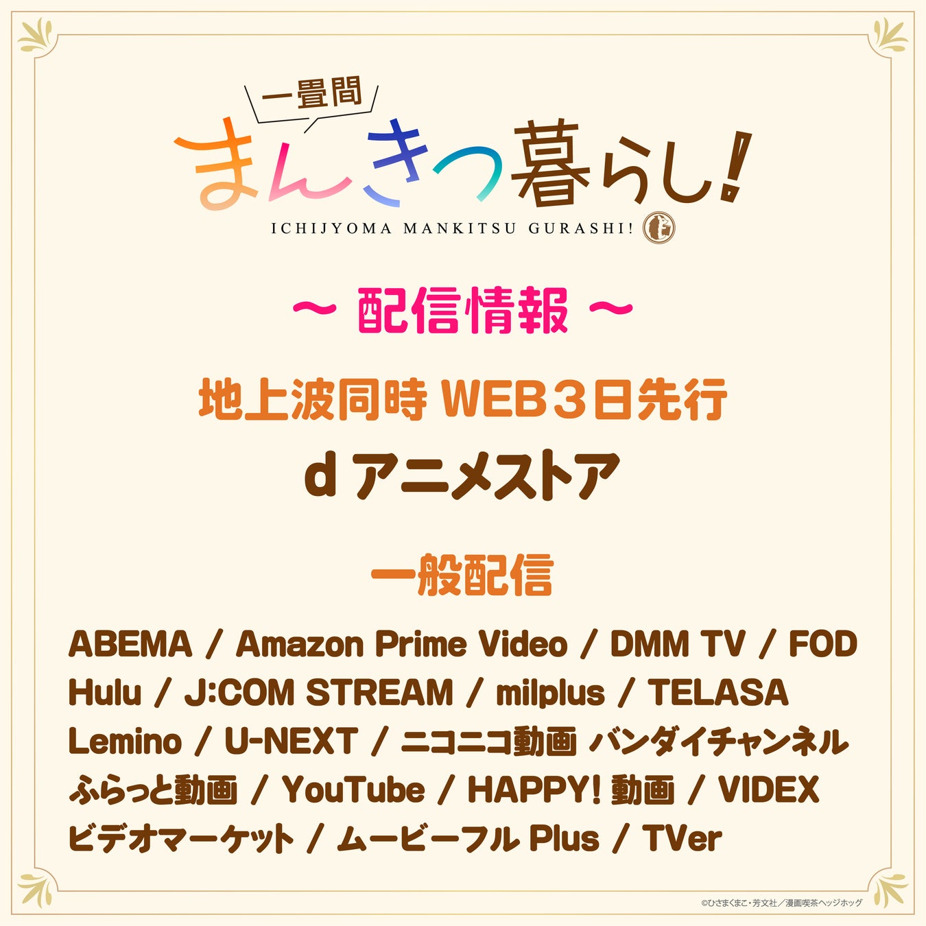 株式会社ブシロード(本社:東京都中野区、代表取締役社長:木谷高明)のグループ会社にあたる株式会社ブシロードムーブ(本社:東京都中野区、代表取締役社長:大貫佑介)は、芳文社「まんがタイムきらら」にて連載中の『一畳間まんきつ暮らし!』(著:ひさまくまこ)のTVアニメの放送情報の追加解禁や配信情報、AnimeJapan 2026でのSNSキャンペーンの情報などの新規情報を多数公開したことをご案内致します。
