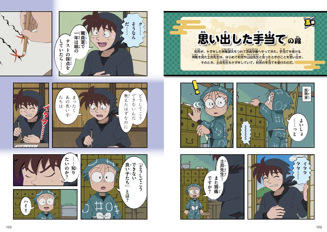 傷(きず)の手当てをしていた食満留三郎(けまとめさぶろう)先輩と善法寺伊作(ぜんぽうじいさく)先輩。乱太郎たちに「これもオレの勝負の一つだ」と言い、伊作先輩が一年生だったころの話を始める。
