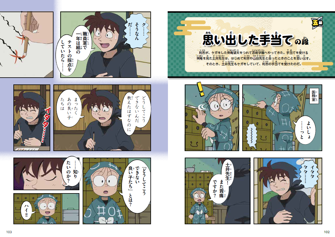 傷(きず)の手当てをしていた食満留三郎(けまとめさぶろう)先輩と善法寺伊作(ぜんぽうじいさく)先輩。乱太郎たちに「これもオレの勝負の一つだ」と言い、伊作先輩が一年生だったころの話を始める。
