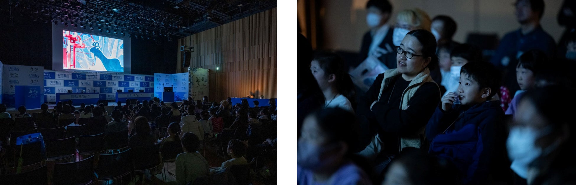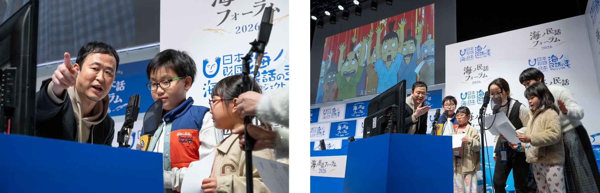 2025年度に制作された最新作から、「クジラとイノシシ」(高知県室戸市)や「織姫塚」(茨城県大洗町)など、全国の海の物語を上映しました。上映前には沼田心之介監督が登壇。このあとアフレコ体験があることにも触れ、「日本にはたくさんの海の昔ばなしが残っています。おじいちゃんやおばあちゃんよりもっと前の人たちが、どんな風に海と関わってきたのか、アニメを通じて知ってもらえると嬉しいです。これまで100作品以上作ってきましたが、声優2名で1000近くのキャラクターを演じてもらっています。声優さんの演じ分けにも注目して見てほしいです。」と、作品に込めた願いを子どもたちに語りかけました。