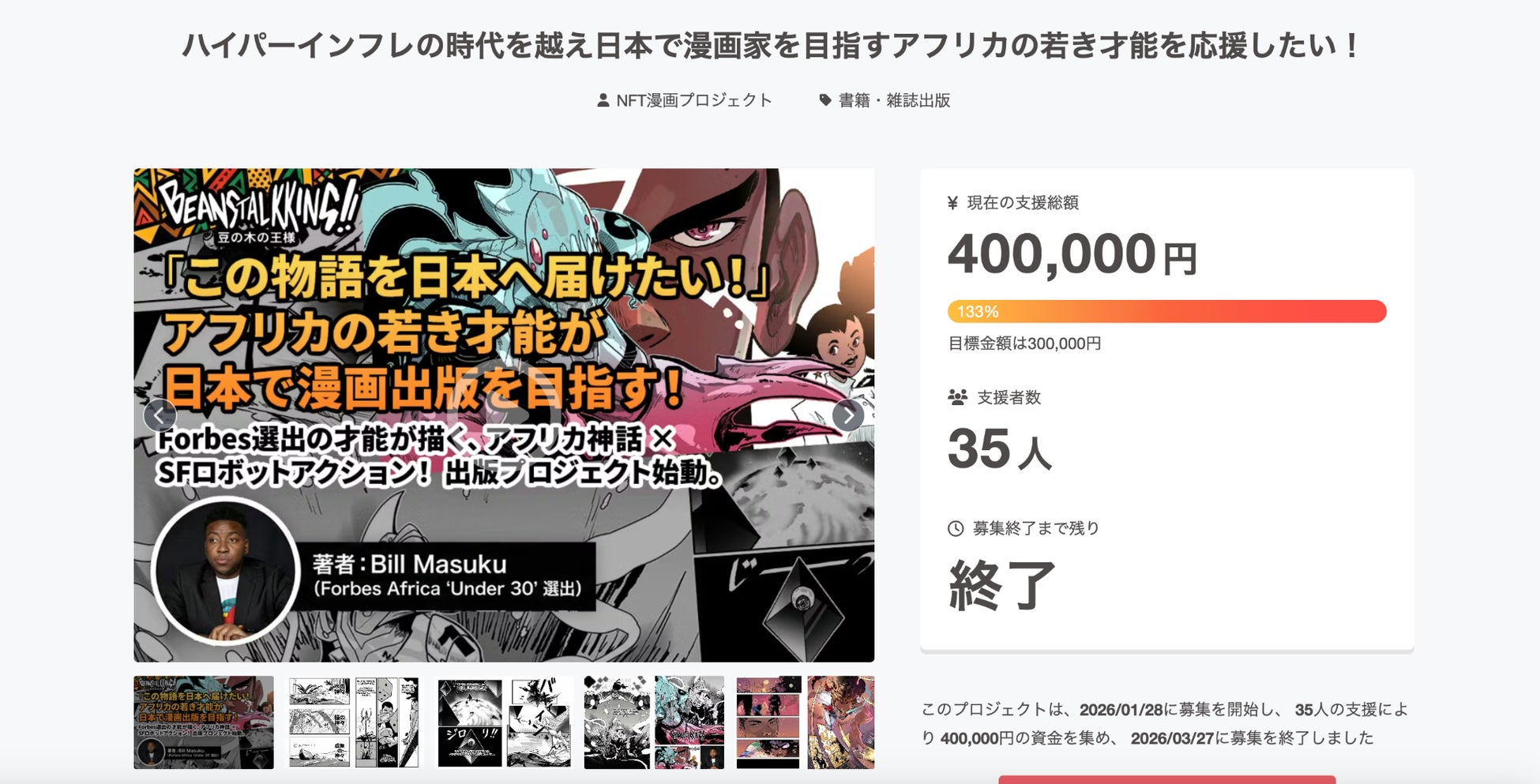 「NFT漫画プロジェクト in アフリカ」では、Bill Masuku氏のほかにも2名の作家がCAMPFIREにて出版を目指して挑戦中です。こちらもぜひ応援をお願いいたします。