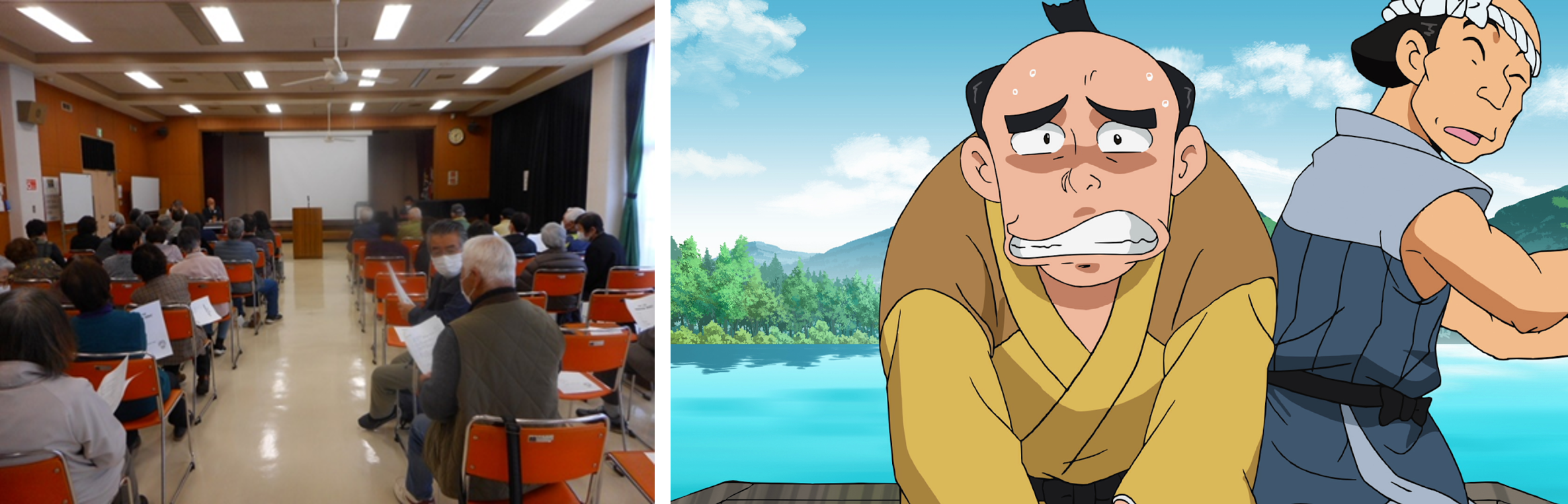 いわゆるオチのついた本民話は5分間という短さもあって受講者に大好評で、会場は爆笑の渦に包まれました。アニメーションを通じて地域の海と歴史の繋がりを伝えるとともに、川と海を繋ぐ文化への理解を深める一助となりました。