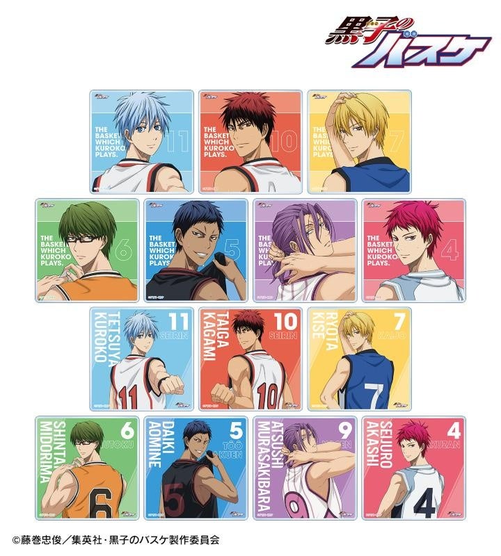 黒子テツヤ、火神大我、黄瀬涼太、緑間真太郎、青峰大輝、紫原 敦、赤司征十郎の描き下ろしイラストをアクリルコースターに仕上げました。