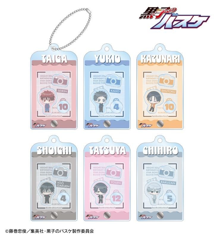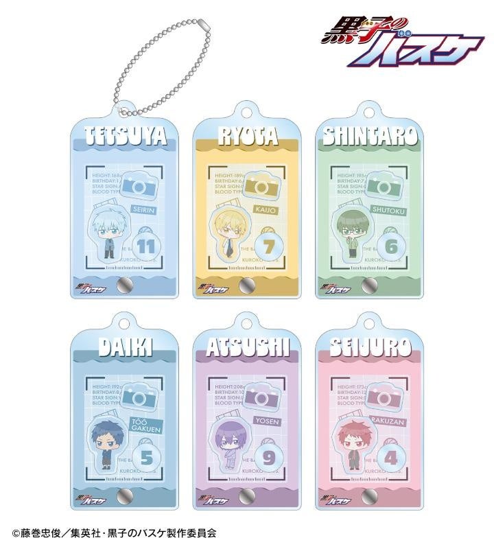 アクリルフレームの中に、火神大我、笠松幸男、高尾和成、今吉翔一、氷室辰也、黛 千尋の描き起こしちびキャライラストの小さなパーツが入っている、パーツ付きフレームアクリルチャームです。