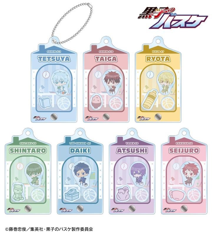アクリルフレームの中に、黒子テツヤ、火神大我、黄瀬涼太、緑間真太郎、青峰大輝、紫原 敦、赤司征十郎の描き起こしちびキャライラストの小さなパーツが入っている、パーツ付きフレームアクリルチャームです。