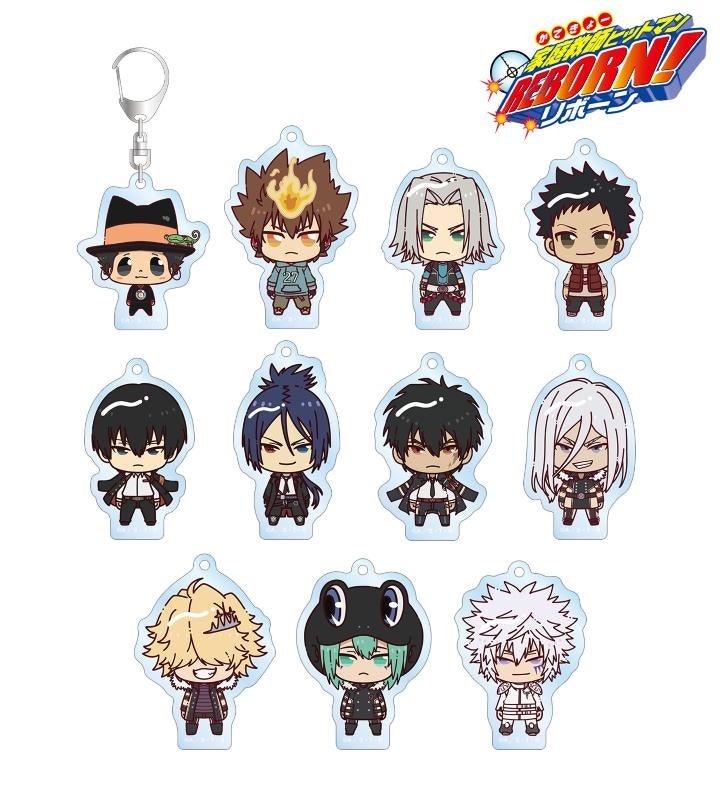 リボーン、沢田 綱吉、獄寺 隼人、山本 武、雲雀 恭弥、六道 骸(10年後)、XANXUS(10年後)、スペルビ・スクアーロ(10年後)、ベルフェゴール(10年後)、フラン、白蘭がちょこんと立っているちびキャラを新たに描き起こし、アクリルキーホルダーに仕上げました。