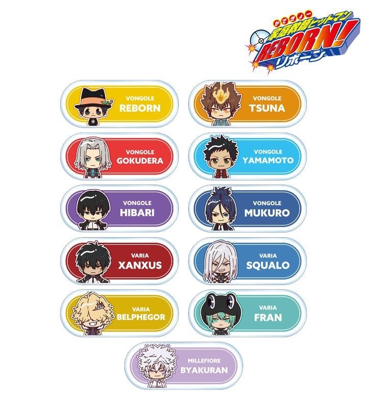 リボーン、沢田 綱吉、獄寺 隼人、山本 武、雲雀 恭弥、六道 骸(10年後)、XANXUS(10年後)、スペルビ・スクアーロ(10年後)、ベルフェゴール(10年後)、フラン、白蘭がちょこんと立っているちびキャラを新たに描き起こし、アクリルネームプレートに仕上げました。