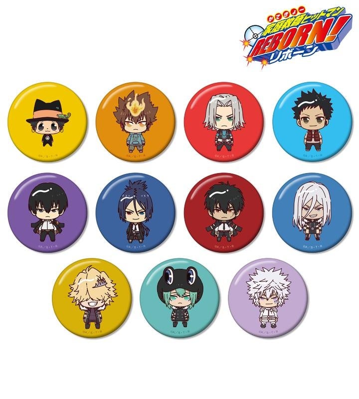 リボーン、沢田 綱吉、獄寺 隼人、山本 武、雲雀 恭弥、六道 骸(10年後)、XANXUS(10年後)、スペルビ・スクアーロ(10年後)、ベルフェゴール(10年後)、フラン、白蘭がちょこんと立っているちびキャラを新たに描き起こし、缶バッジに仕上げました。