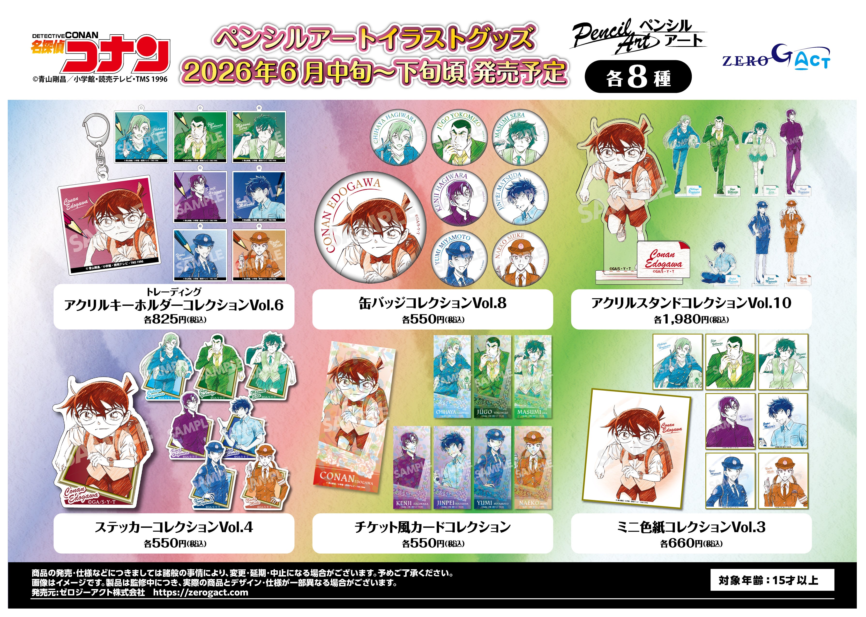 アニメ・キャラクター雑貨や、オリジナル商品の企画デザイン・製造販売を行うゼロジーアクト株式会社(本社:東京都台東区 ※朝日放送グループ)は、「名探偵コナン」ペンシルアートシリーズより、TDアクリルキーホルダーコレクションVol.6、缶バッジコレクションVol.8、アクリルスタンドコレクションVol.10、ステッカーコレクションVol.3、チケット風カードコレクション、ミニ色紙コレクションVol.3の6アイテムの予約受付を開始しました。水彩鉛筆の繊細なタッチが美しい『ペンシルアート』を使用した各アイテムのラインナップは、江戸川コナン・萩原千速・横溝重悟・世良真純・萩原研二・松田陣平・宮本由美・三池苗子の全8種。