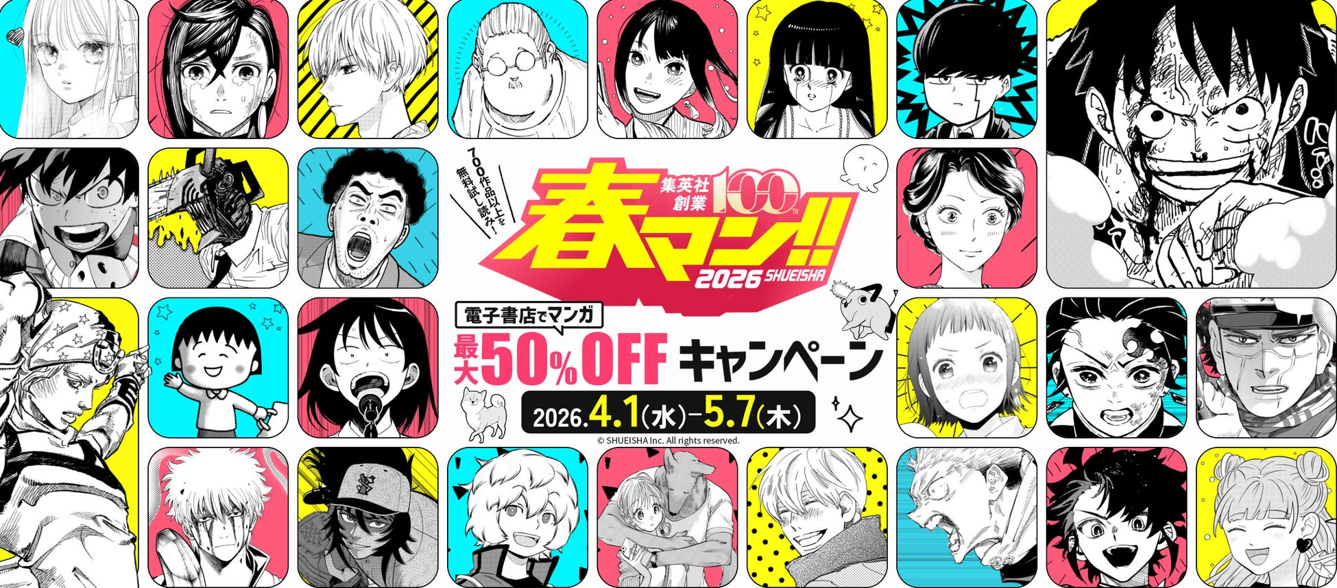 株式会社 集英社では配信中のデジタルコミックのキャンペーンとして、毎年恒例・春を彩るマンガの祭典「春マン!! 2026」を2026年4⽉1⽇(水)〜5⽉7⽇(木)に実施いたします。