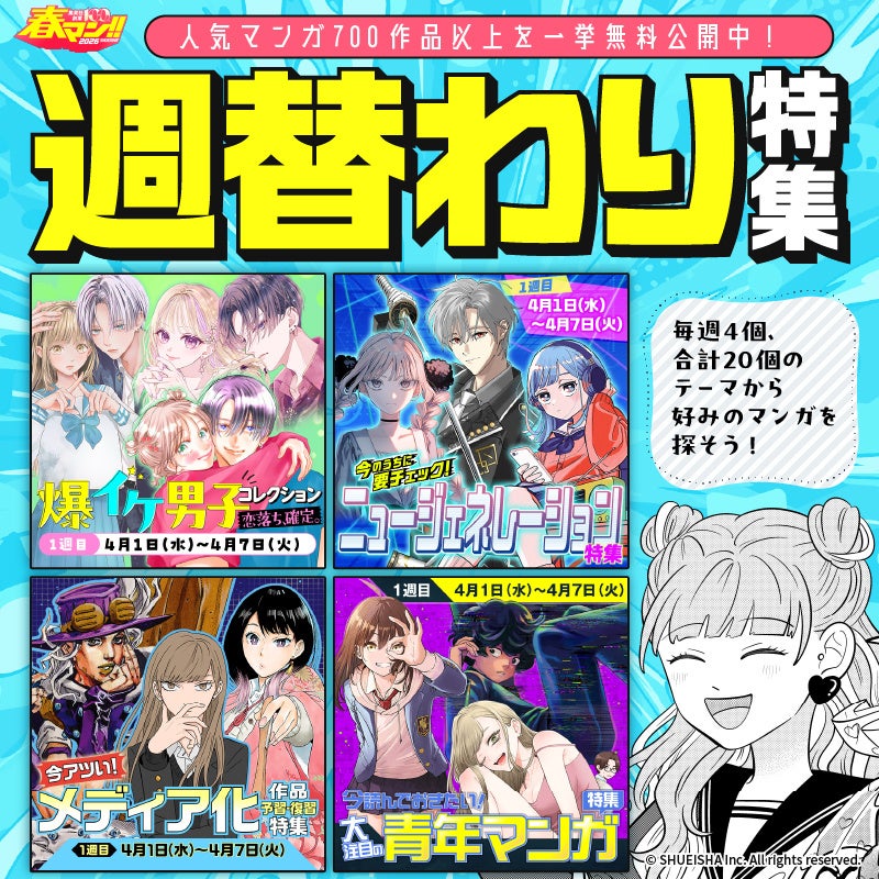 株式会社 集英社では配信中のデジタルコミックのキャンペーンとして、毎年恒例・春を彩るマンガの祭典「春マン!! 2026」を2026年4⽉1⽇(水)〜5⽉7⽇(木)に実施いたします。
