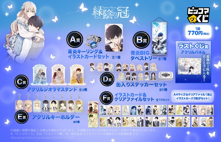 A賞は、凛とした表情が目を惹くペネロペのフィギュア。B賞のBIGアクリルジオラマスタンドや、作中のキーアイテムをイメージしたC賞のアミュレットなど、物語の緊迫感とときめきを詰め込んだアイテムが勢揃いです。 D賞からF賞には、攻略対象たちとの名シーンを再現したアクスタやタロット風カードも!ラストくじ賞は、ドレスをシックなブラックに着替えたピッコマくじ限定ver.のフィギュアです。 命がけの恋の行方を、ぜひお手元でお楽しみください。