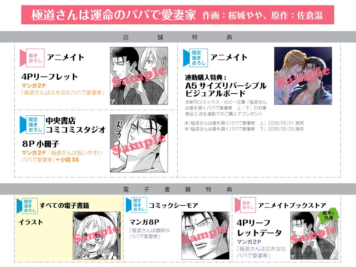 原作小説『極道さんはパパで愛妻家』(ルビー文庫刊)が2016年に刊行開始してから今年10周年となるのを記念し、アニメイトにて著者の佐倉温先生と挿絵・コミカライズの作画を担当する桜城やや先生のサイン会を行います。
