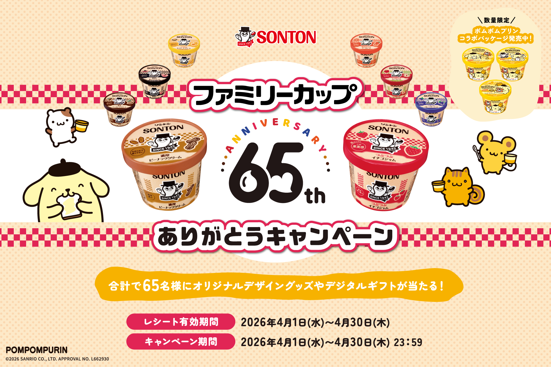 ■ポムポムプリンのオリジナルグッズが当たる!「ファミリーカップ65周年ありがとうキャンペーン」