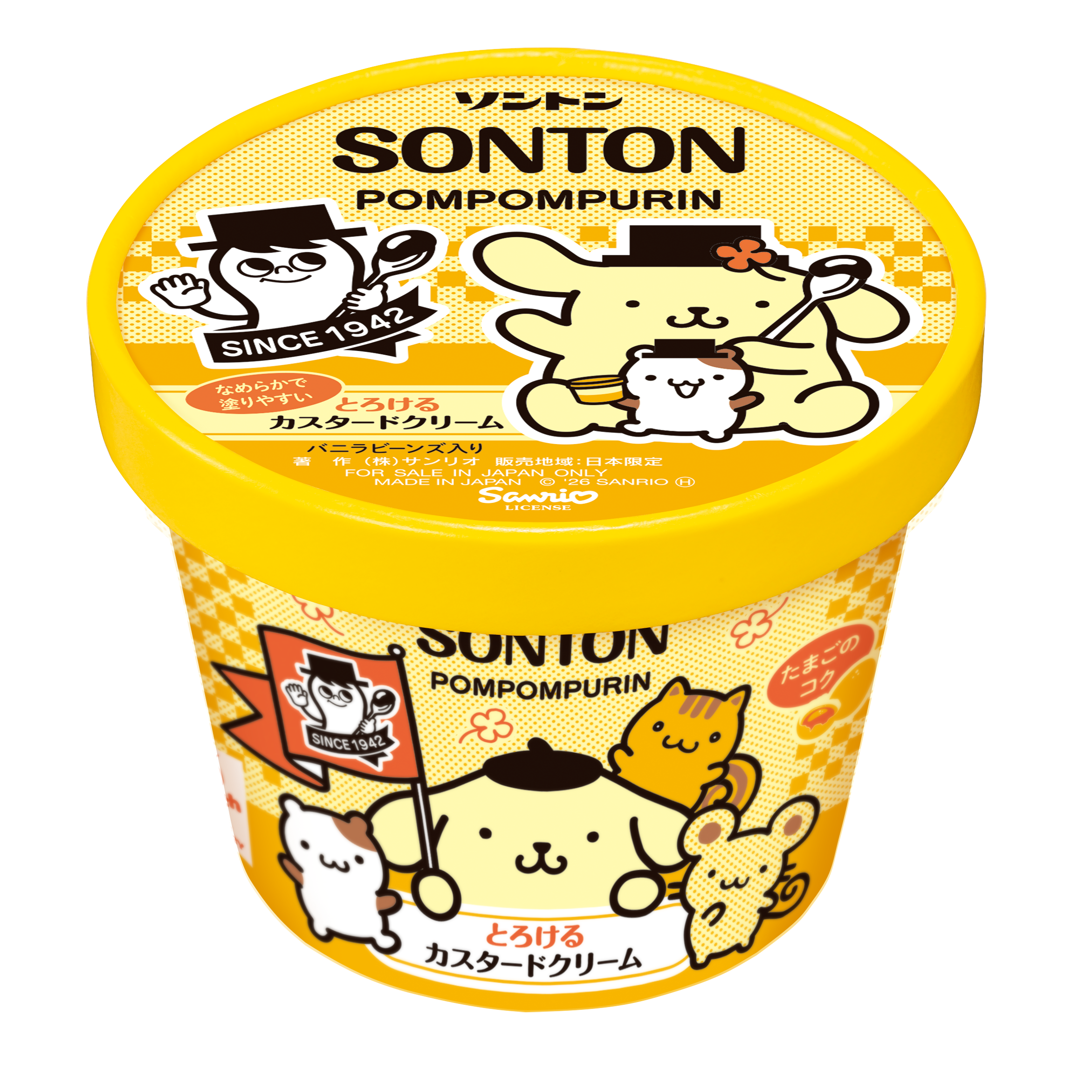 1960年に発売を開始した「ファミリーカップ」は、2025年10月に発売65周年を迎えました。これを記念して、「ファミリーカップ とろけるカスタードクリーム」のパッケージに、今年デビュー30周年を迎えた「ポムポムプリン」がデザインされた限定パッケージを発売いたしました。