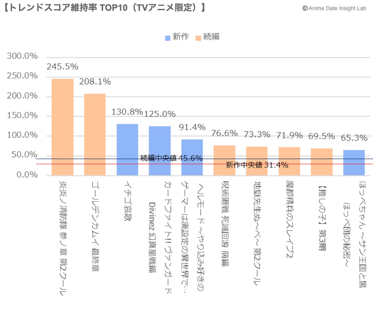 算出方法は「直近週÷初週」。8週以上データのある作品を対象としている。参考値として、テレビアニメ全体のトレンドスコア維持率の中央値は、新作が31.4%、続編が45.6%だった。つまり平均的な新作は、直近週には初週の3割程度まで検索が落ちるということだ。