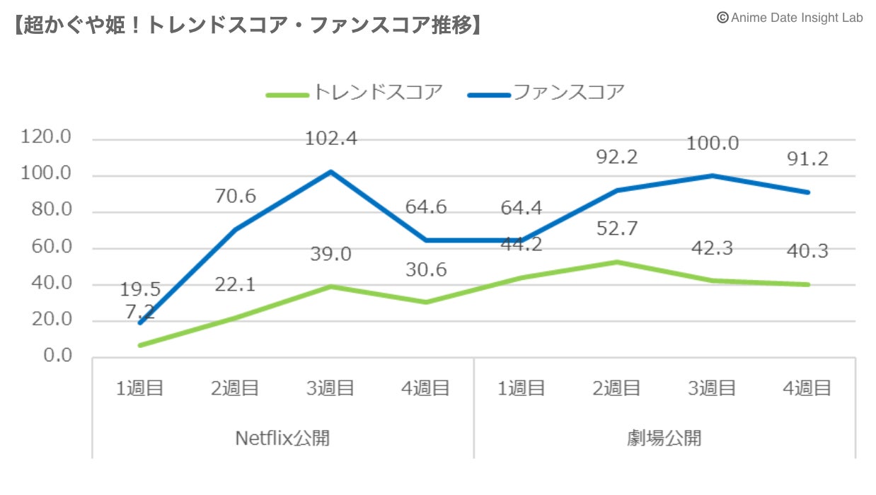 『超かぐや姫!』はまずNetflixで配信され、ファンスコアは配信1週目19.5→2週目70.6→3週目102.4と急伸した。この時点ですでに「配信だけでも十分に語られた作品」だったが、話題はここで終わらなかった。