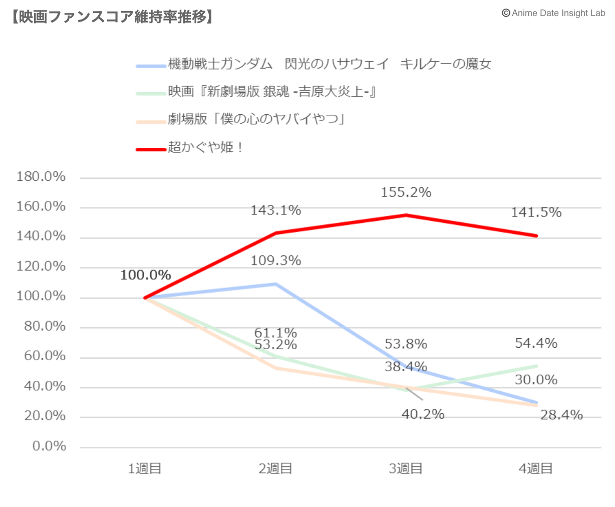 『超かぐや姫!』はこの減衰パターンから完全に外れた。劇場公開後のファンスコアは公開週64.4→2週目92.2(143%)→3週目100.0(155%)と上がり続けた。公開から3週間、他の映画が半分以下に落ちていくなかで、この作品だけが反対方向に動いた。