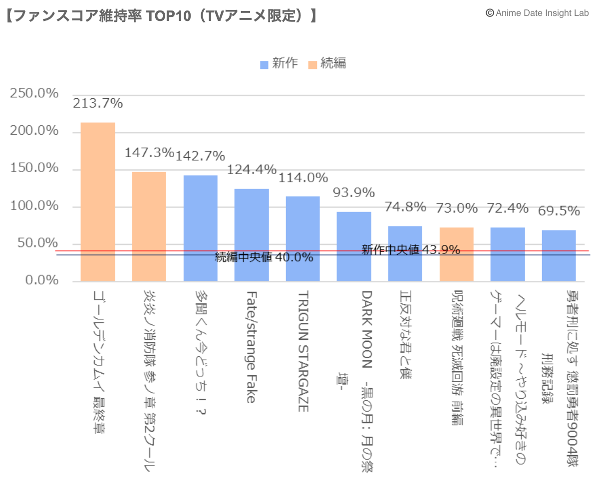 ここで興味深い逆転が起きている。中央値を見ると、新作43.9%に対して続編40.0%。トレンドスコア維持率では続編が新作を上回っていたのに、ファンスコア維持率では新作が逆転した。
