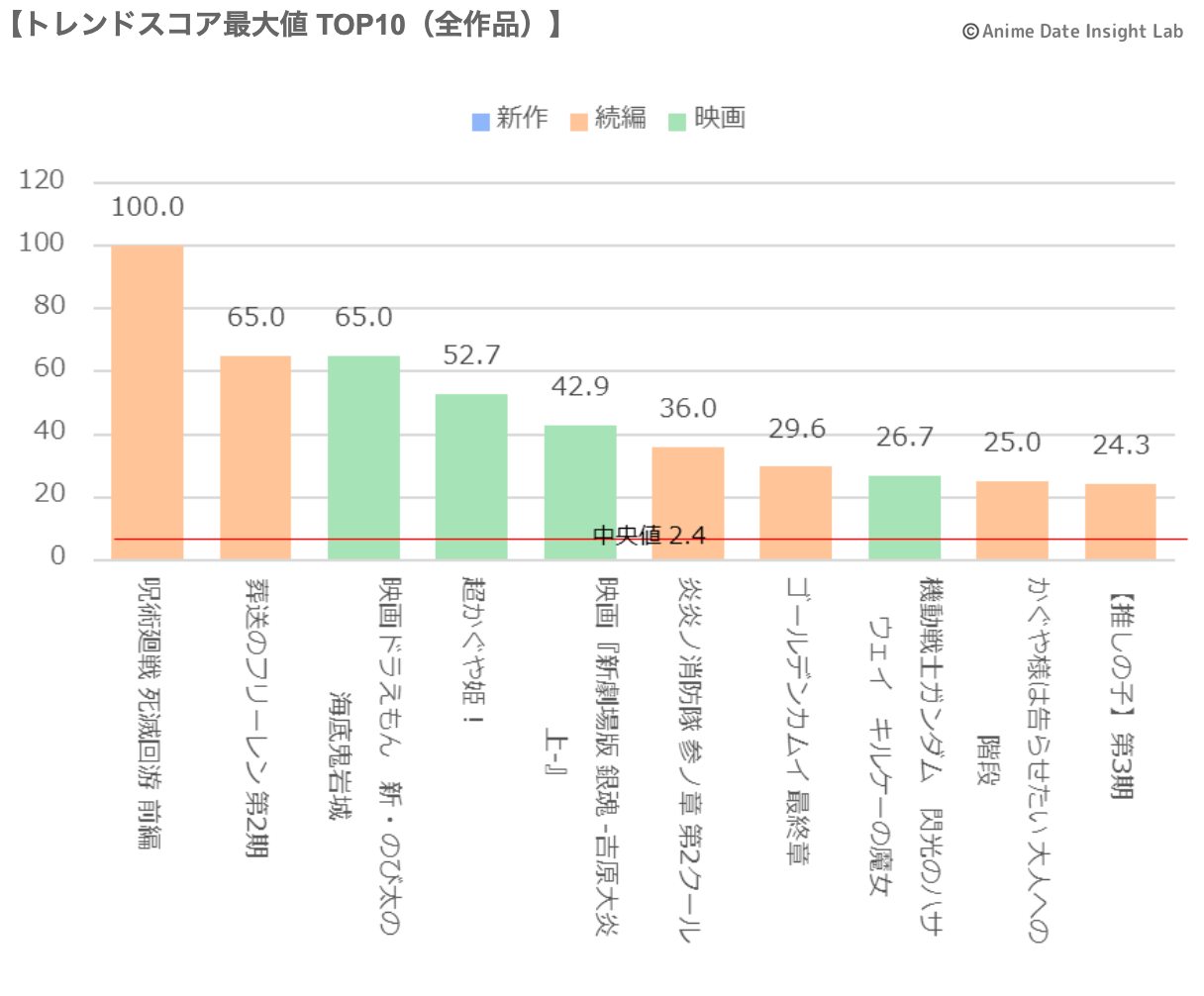 トレンドスコアの最大値では、『呪術廻戦 死滅回游 前編』が100.0で1位。3週目に記録した数値で、初速からさらに上がった形だ。TOP10中4作品が映画という構成は、今季の劇場アニメの存在感を物語っている。