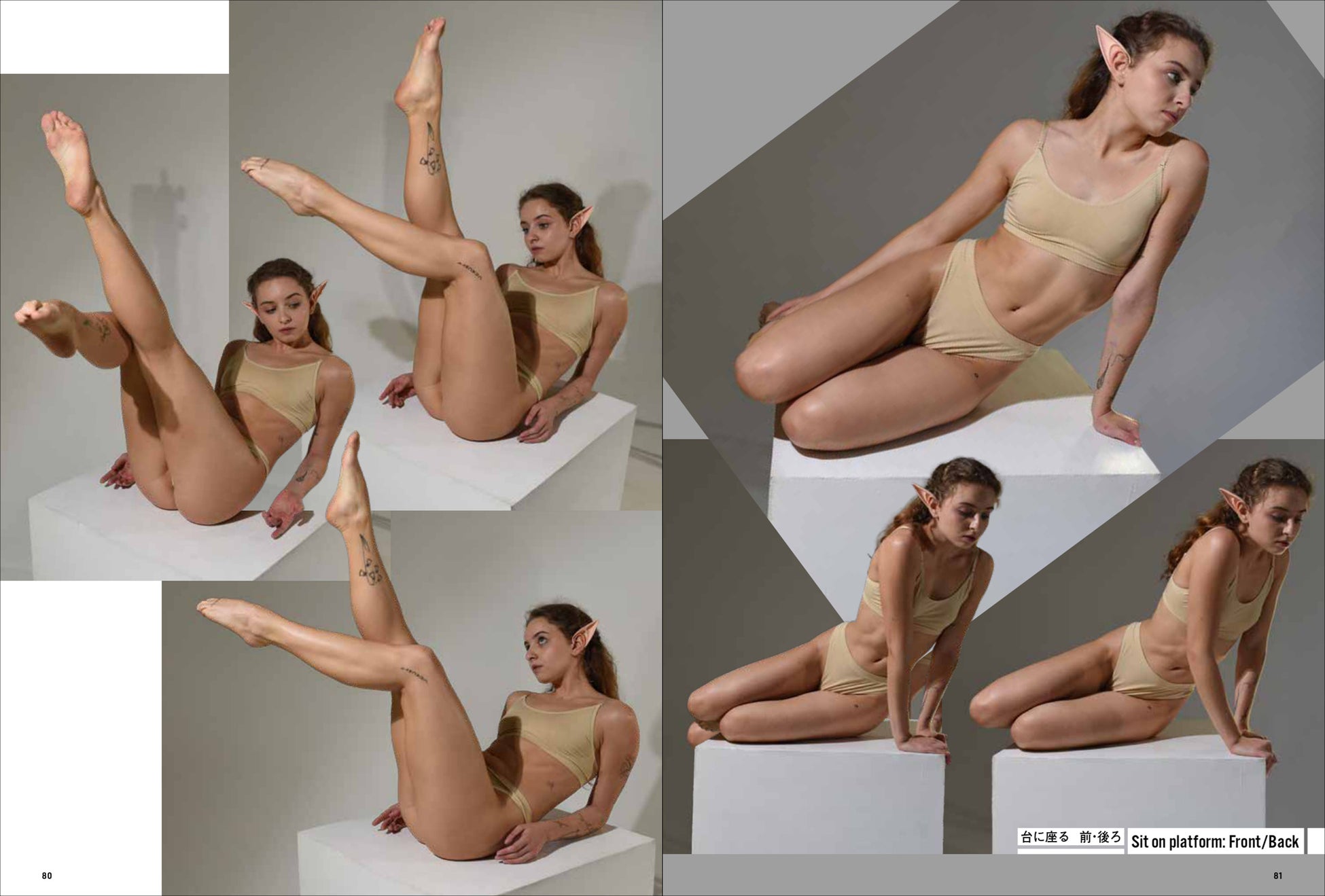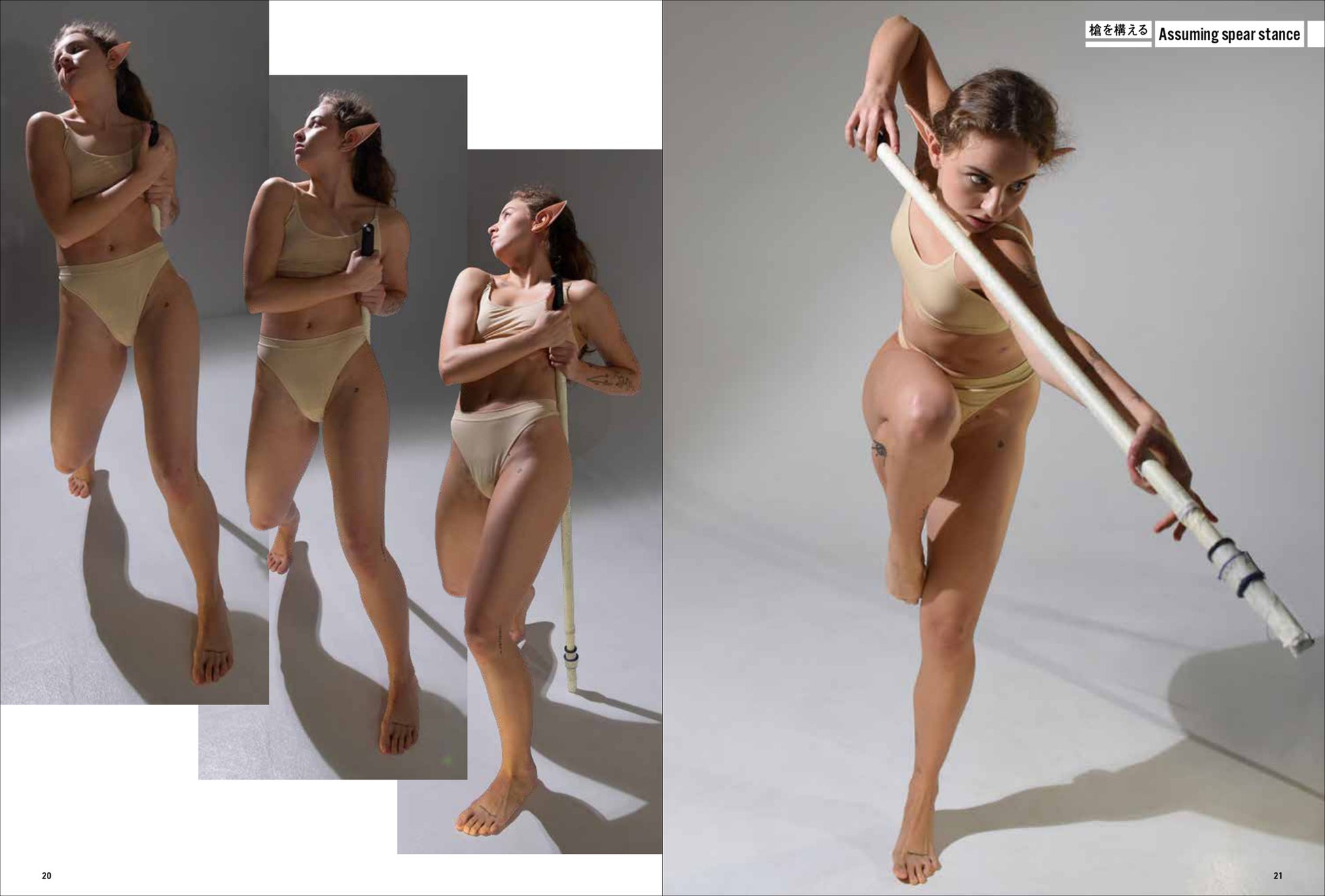 第一弾は「妖精・エルフ」。エルフの耳をつけて動き、様々なポーズをあおり、ふかん、連写など複数の画角で撮影しています。描くのが難しい「エルフ耳」の向きや位置も本書では一目瞭然。輪郭ラインのわかる水着と鍛えた筋肉で、戦うポーズから水辺でくつろぐポーズまで、バリエーション豊かなシチュエーションと動きを網羅します。