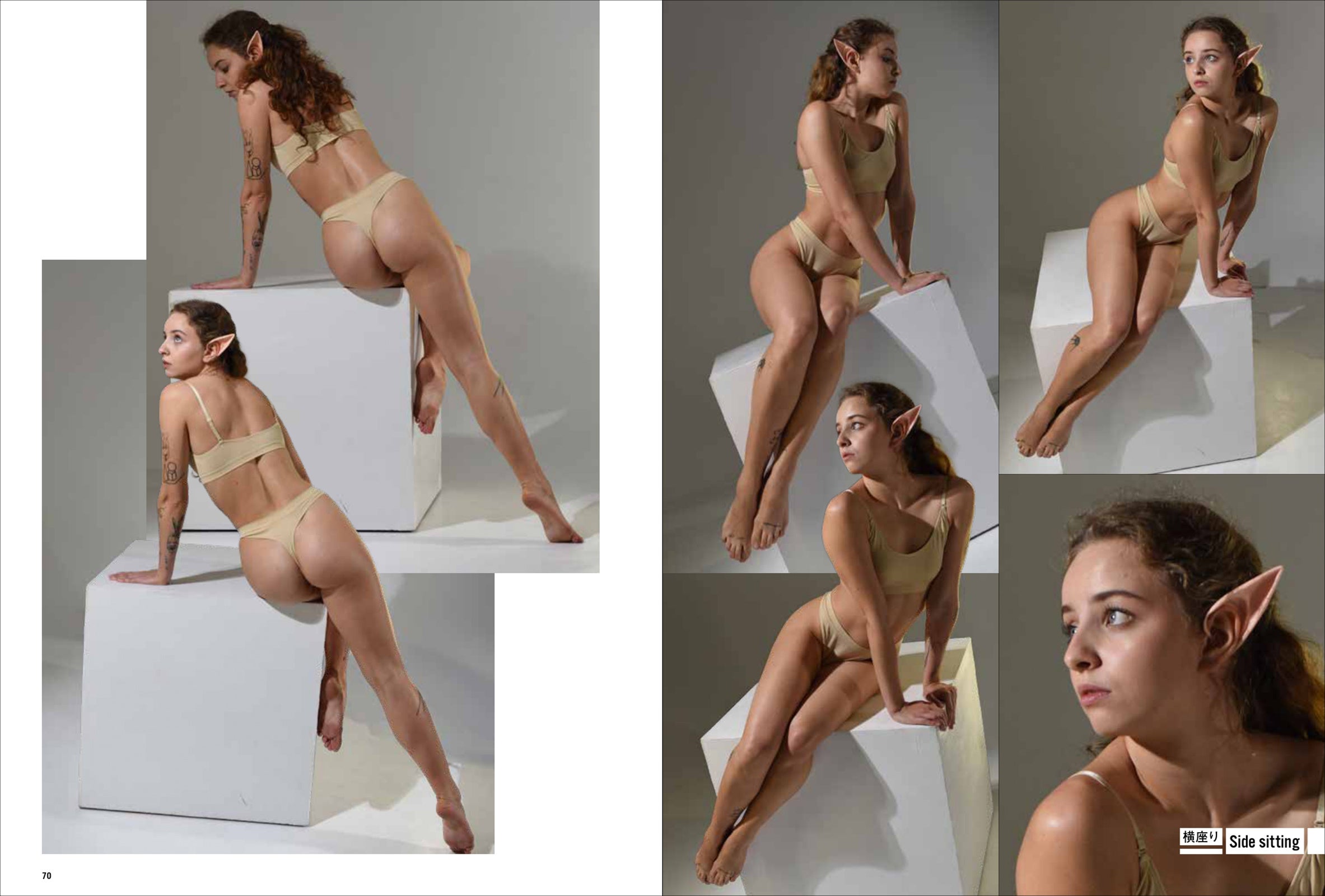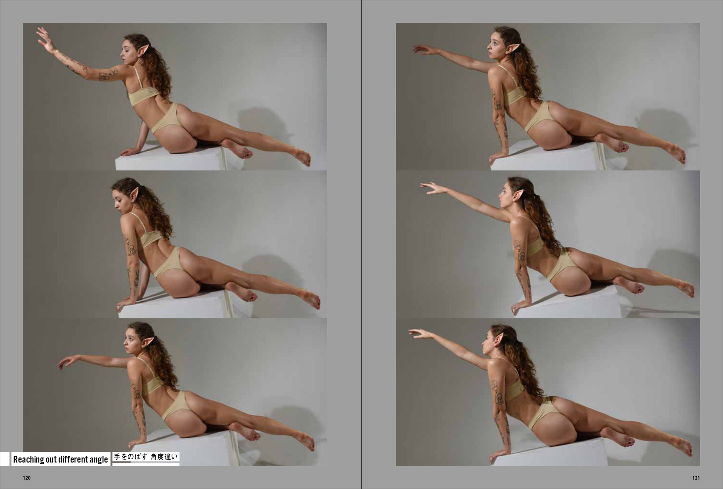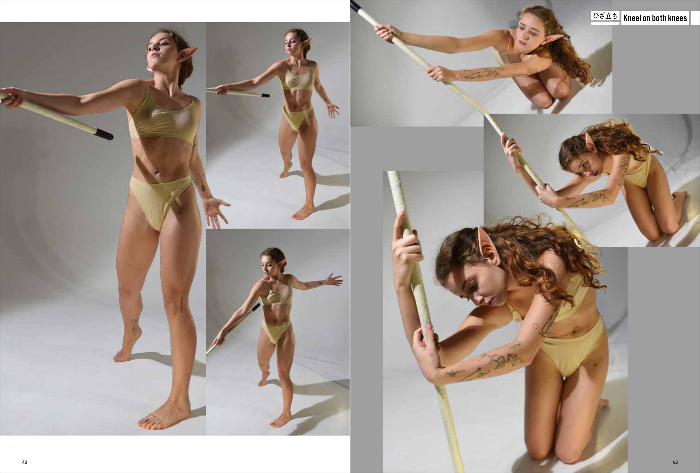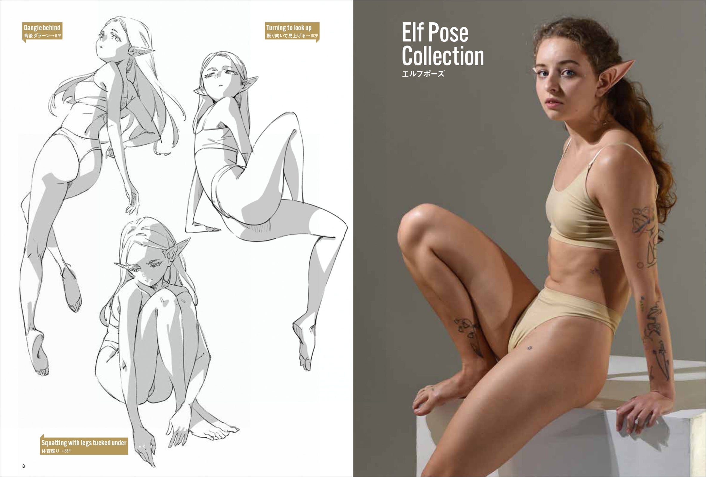 第一弾は「妖精・エルフ」。エルフの耳をつけて動き、様々なポーズをあおり、ふかん、連写など複数の画角で撮影しています。描くのが難しい「エルフ耳」の向きや位置も本書では一目瞭然。輪郭ラインのわかる水着と鍛えた筋肉で、戦うポーズから水辺でくつろぐポーズまで、バリエーション豊かなシチュエーションと動きを網羅します。