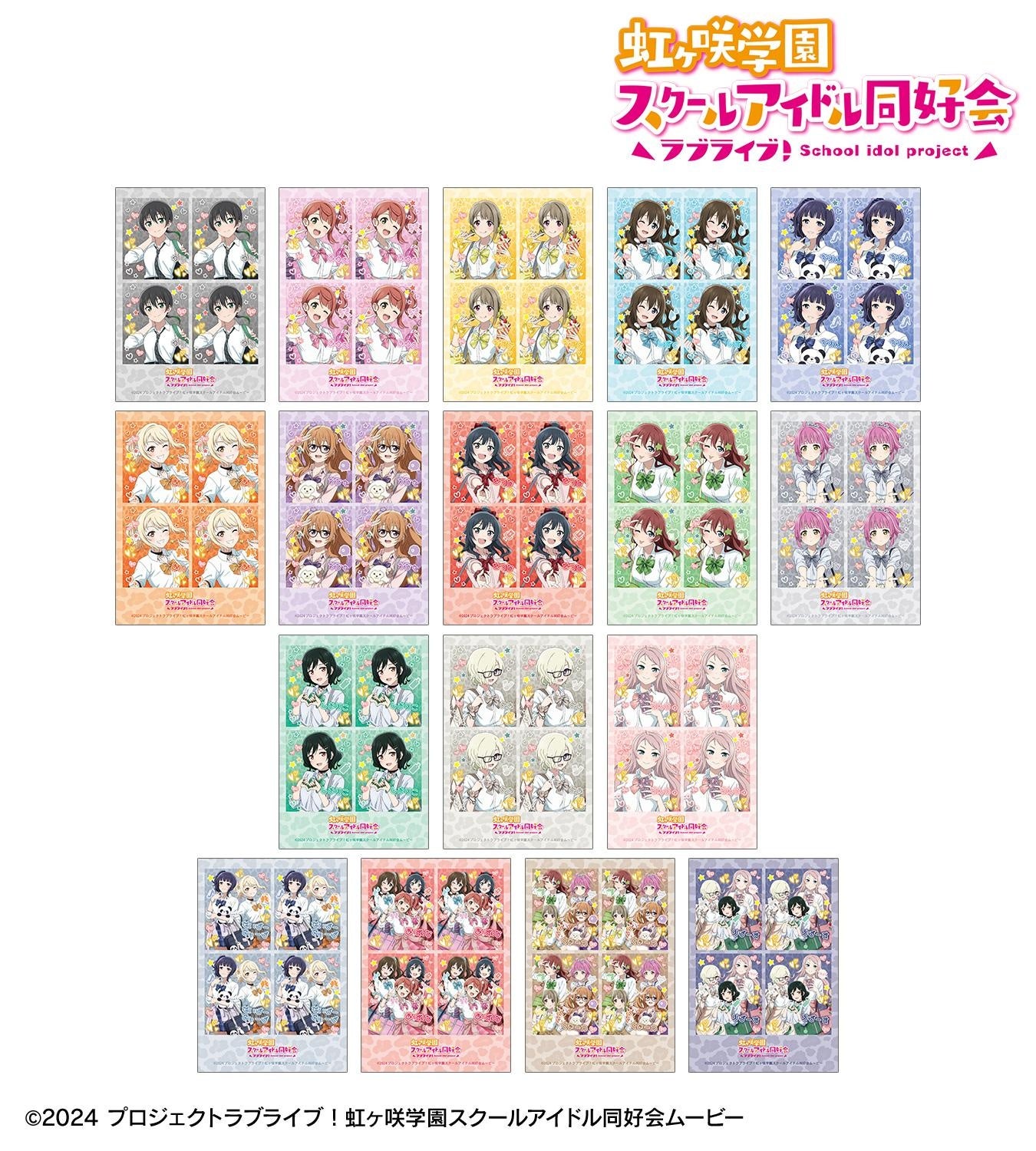 高咲 侑、上原歩夢、中須かすみ、桜坂しずく、朝香果林、宮下 愛、近江彼方、優木せつ菜、エマ・ヴェルデ、天王寺璃奈、三船栞子、ミア・テイラー、鐘 嵐珠の描き下ろしイラストをプリントシール風のブロマイドに仕上げました。