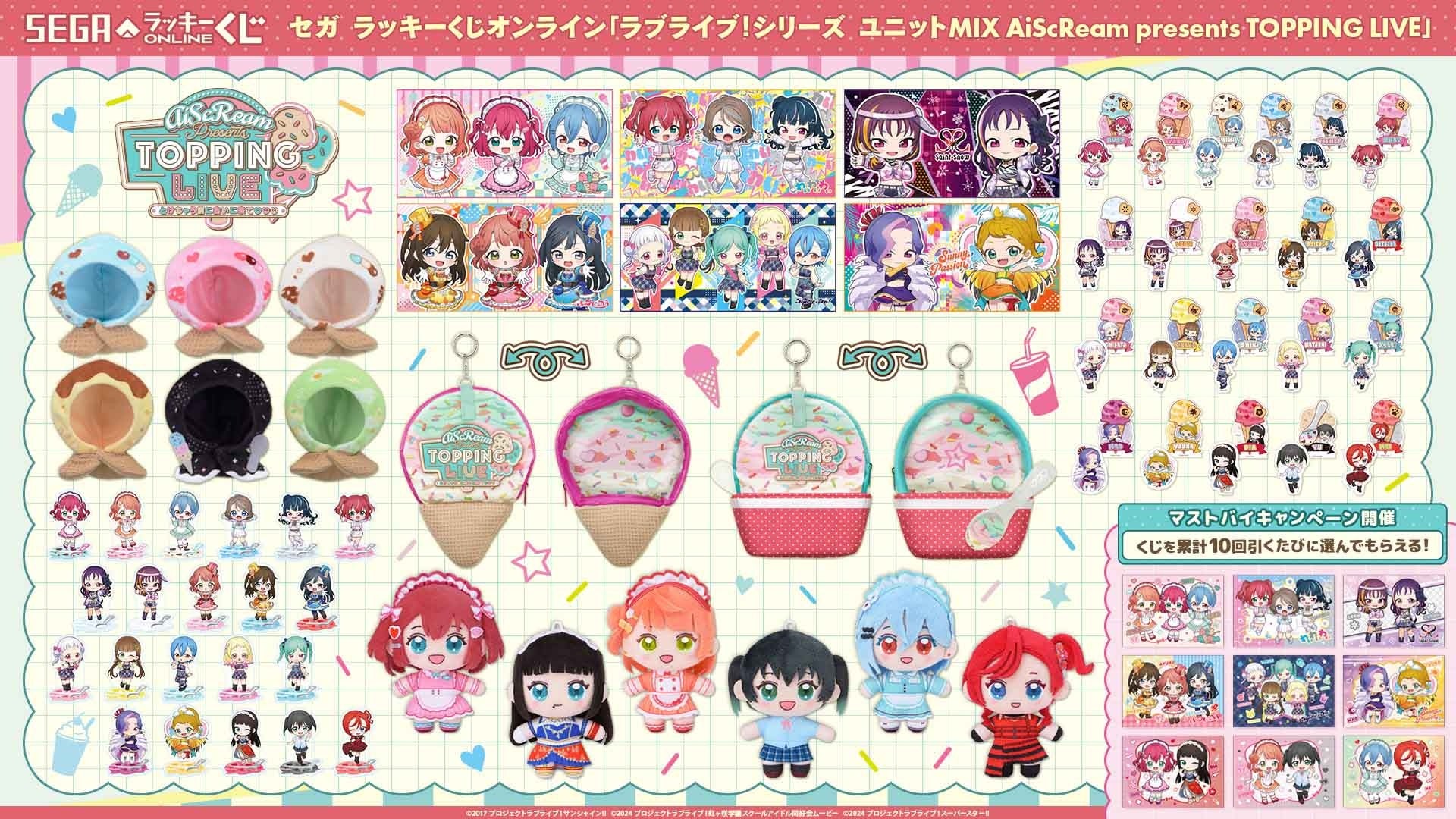 本くじは、2025年に開催されたライブイベント「AiScReam presents TOPPING LIVE とけちゃう前に会いに来て♡♡♡」をテーマに、主催ユニットの「AiScReam」だけでなく、ライブに出演した「トッピングメンバー」や「ラブ♡ブースターゲスト」たちをラインナップに追加したオンラインくじです。