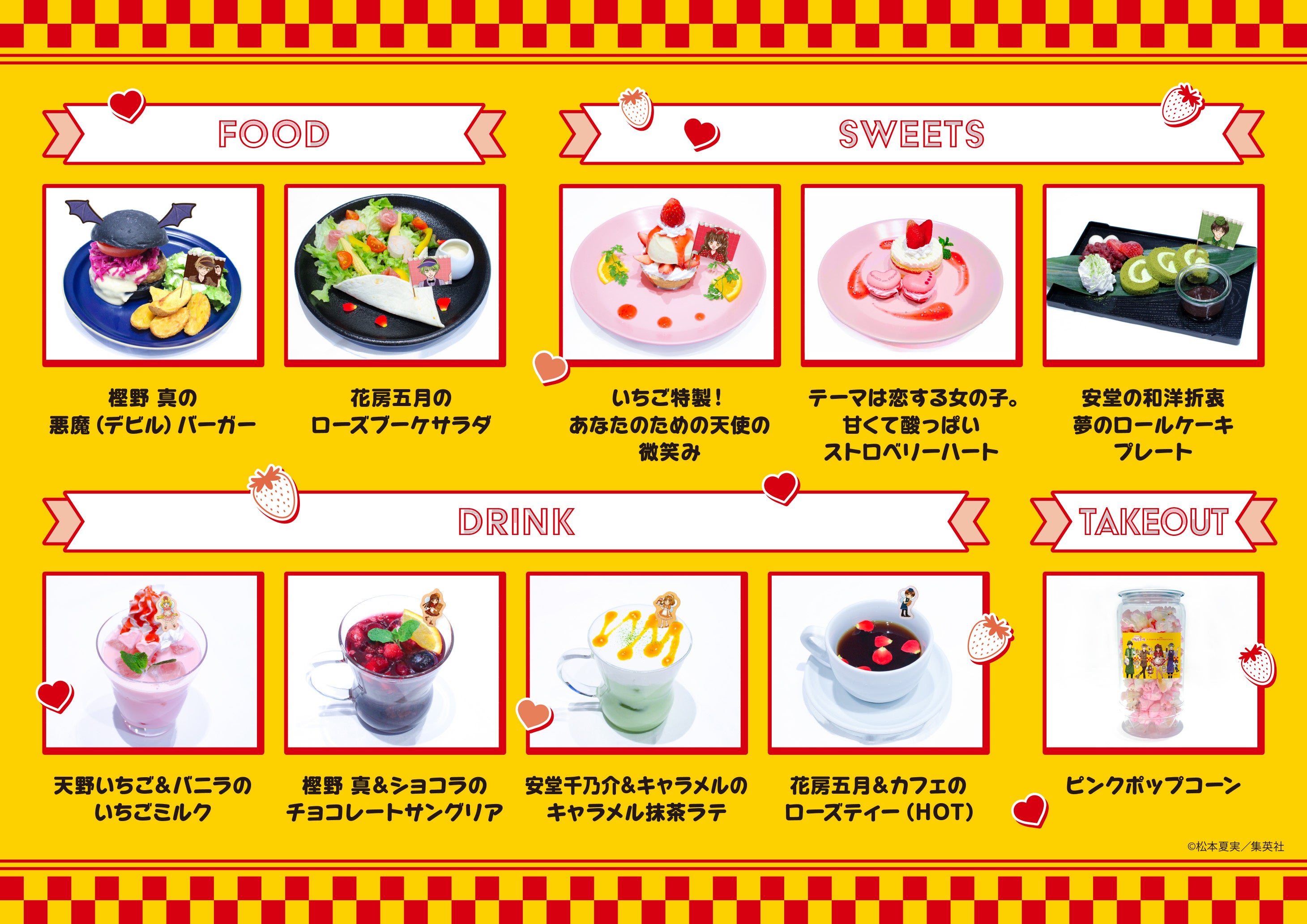 今回のイベントに向けて、作品をイメージしたコラボメニューや、松本夏実先生による「ダイナー」がコンセプトの新規描き下ろしイラストを使用したグッズを多数ご用意いたしました。