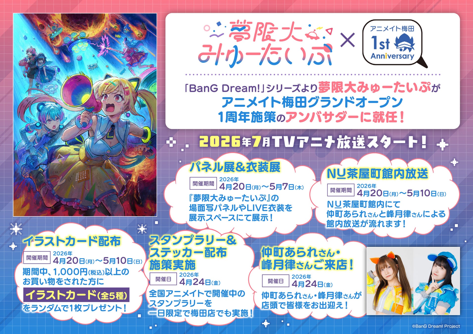 そんなアニメイト梅田は皆様のお陰で無事グランドオープンから1周年を迎えることが出来ました!その記念とお客様への感謝を伝えるイベントを4月20日より順次開催いたします。今回アニメイト梅田1周年のアンバサダーには、『BanG Dream!』プロジェクトより『夢限大みゅーたいぷ』が就任!店内展示スペース「ステージはん」での衣装展示や、NU茶屋町内で流れる館内放送、イラストカードの配布などを実施するほか、1周年当日には『夢限大みゅーたいぷ』の仲町あられさんと峰月律さんが入口にてお客様をお出迎え!