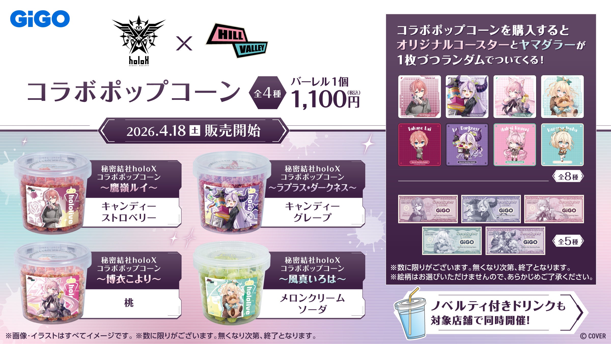 株式会社GENDA GiGO Entertainment(本社:東京都港区 代表取締役社長:二宮 一浩、以下「当社」)は、当社のGiGOグループのお店において、2026年4月18日(土)より、カバー株式会社(本社:東京都港区、代表取締役社長:谷郷元昭)が運営するVTuberグループ「ホロライブ」から生まれたユニット「秘密結社holoX」とのコラボキャンペーンを開催いたします。