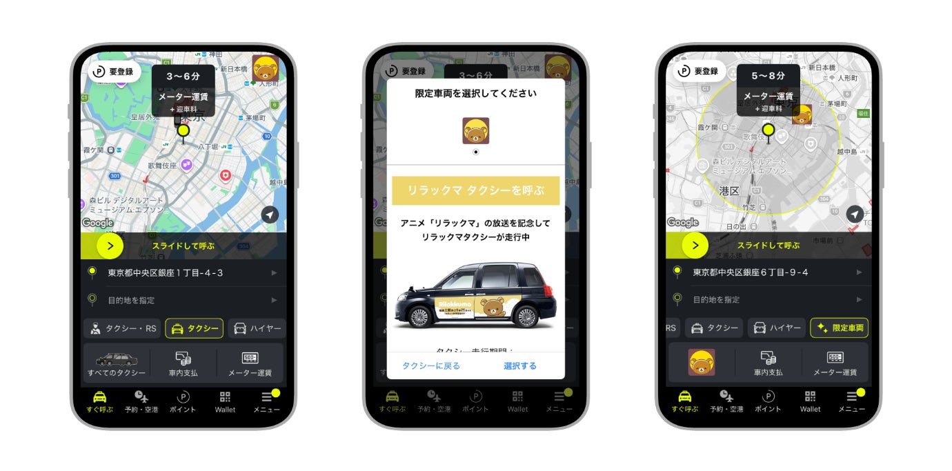 期間中は、「リラックマ」「コリラックマ」「キイロイトリ」「チャイロイコグマ」がそれぞれデザインされた4種類の車両が都内を走行します。タクシーアプリ「S.RIDE」から対象車両の指定配車が可能で、アプリ上の配車画面にはそれぞれのラッピングデザインに合わせた限定アイコンが表示されます。