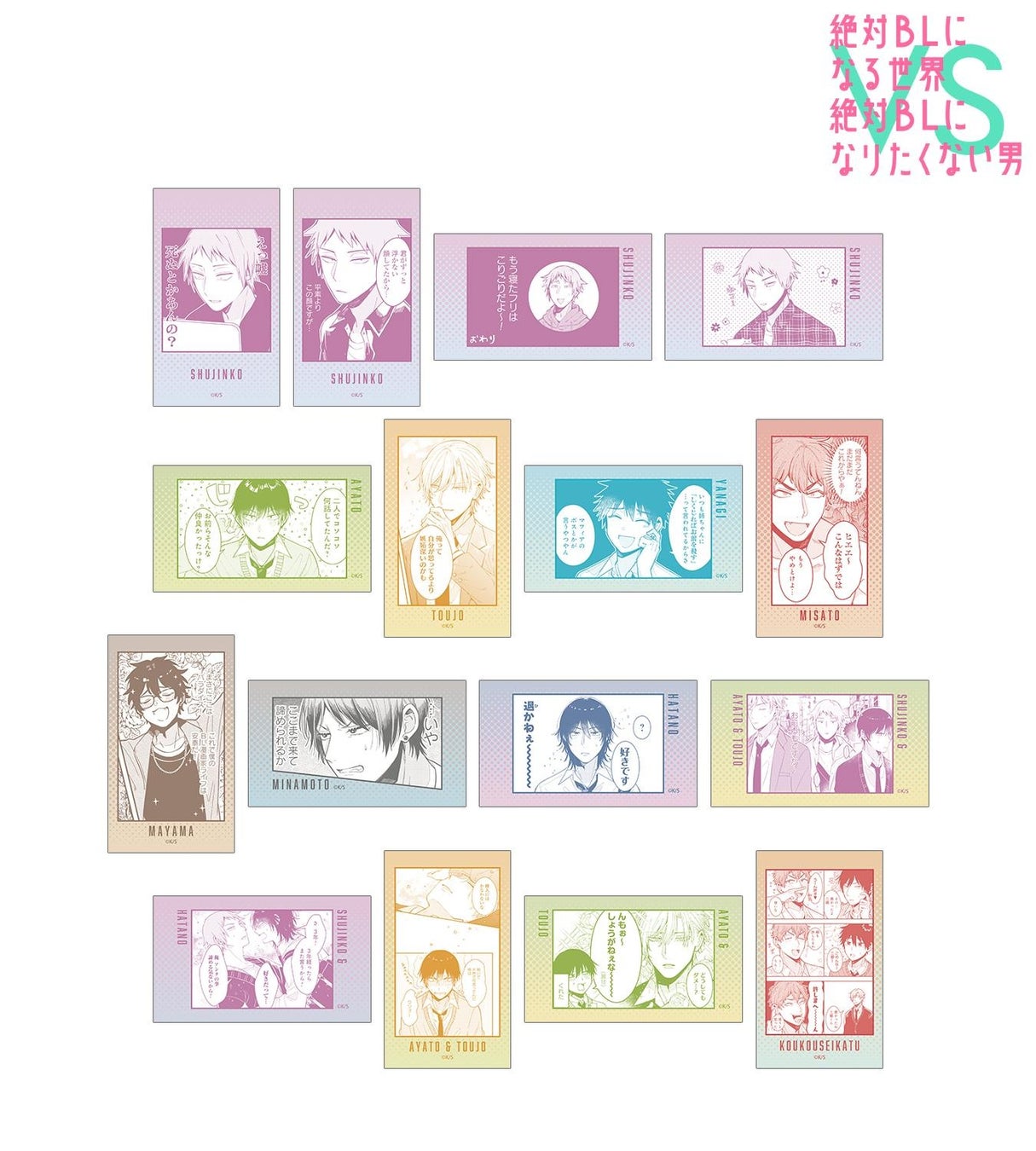 主人公、綾人、東條、柳、三郷、真山、水元、旗野の原作コマをイラストカードに仕上げました。